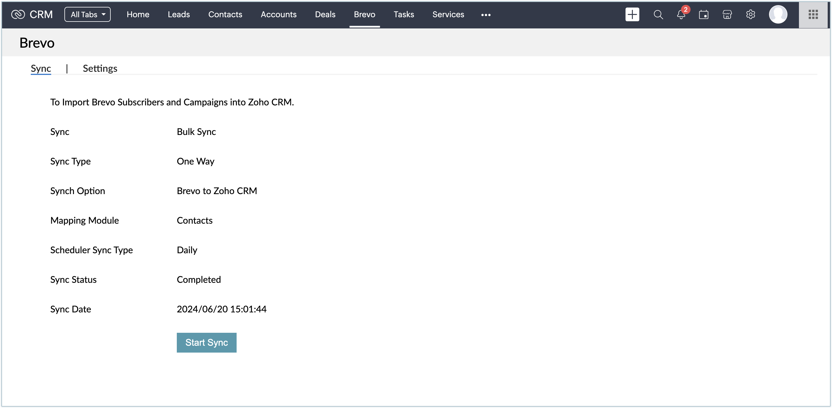 Datele din Brevo pot fi sincronizate cu Zoho CRM și invers. Înainte de a începe sincronizarea, poți configura setările de sincronizare din opțiunile disponibile. Poți alege direcția sincronizării, selecta dacă dorești să imporți totul sau doar anumite contacte și campanii, și te asigura că câmpurile sunt mapate corect pentru a păstra înregistrările tale.