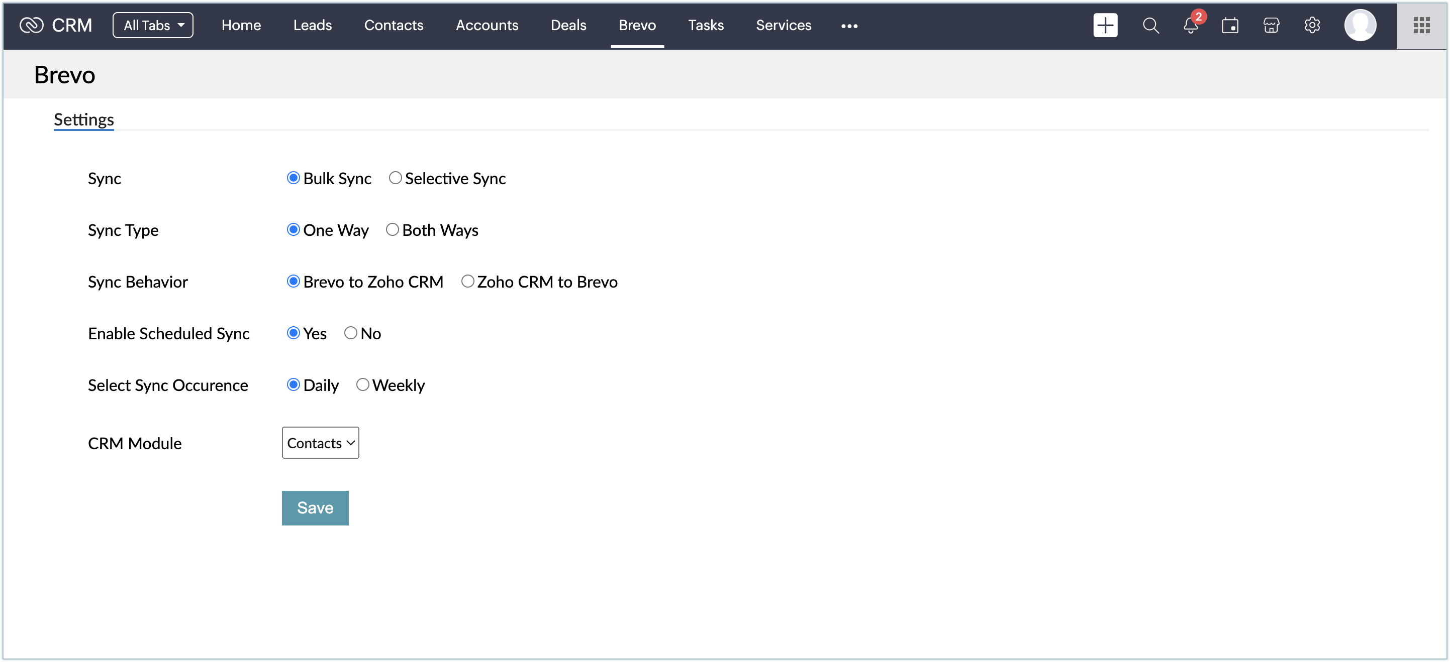 Sincronizarea unidirecțională aduce contactele Brevo în modulele Zoho CRM sau invers, dar nu ambele direcții ca în sincronizarea bidirecțională. - În Sync Behavior, alege Brevo to Zoho CRM / Zoho CRM to Brevo.