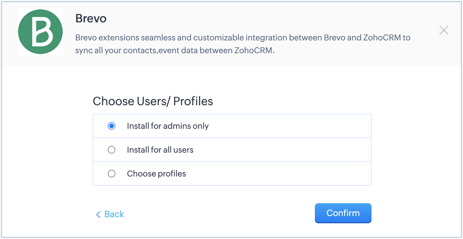 - Choose profiles - Extensia va fi instalată în CRM pentru utilizatorii selectați manual. Alege această opțiune, apasă Confirm, apoi selectează profilurile dorite.