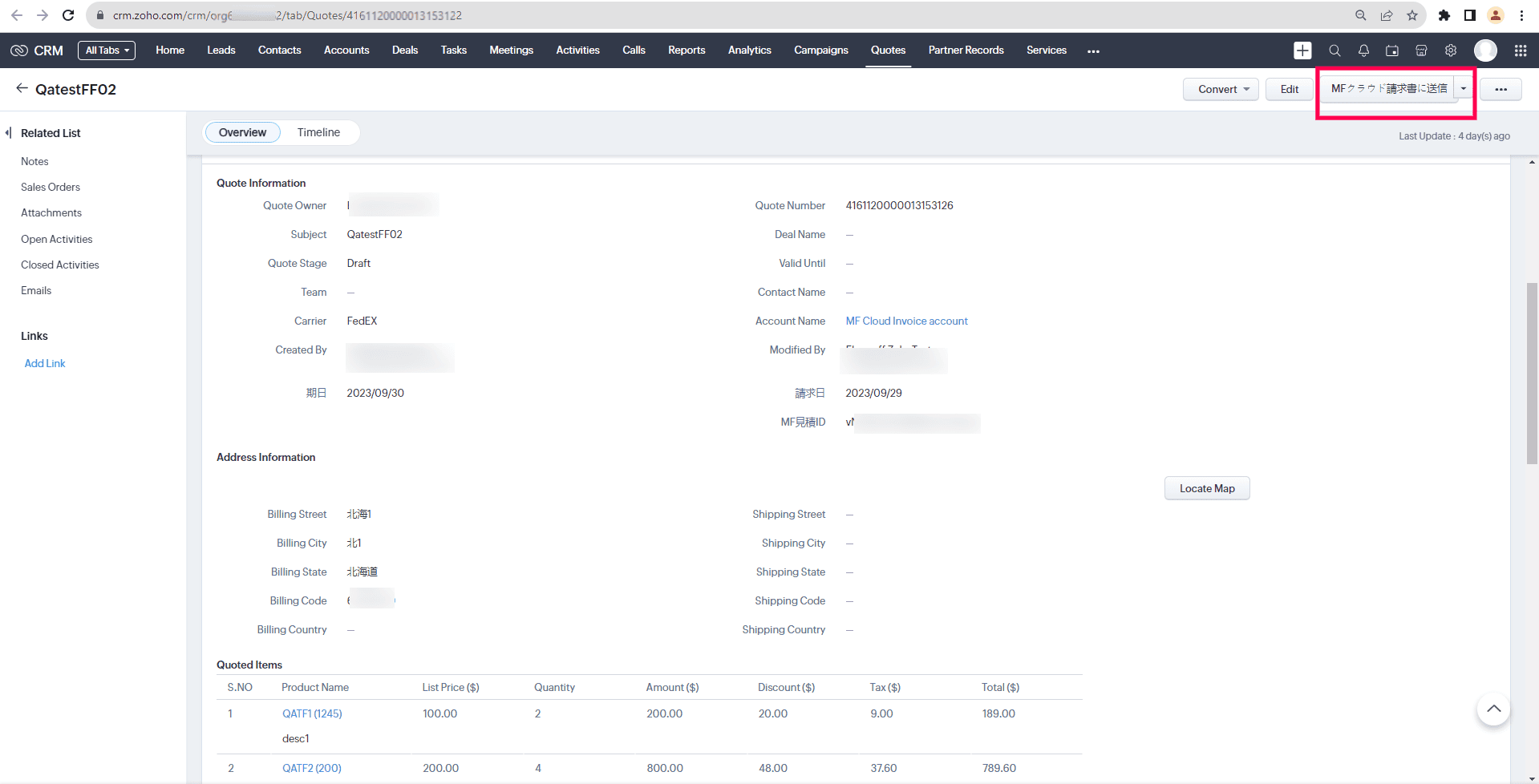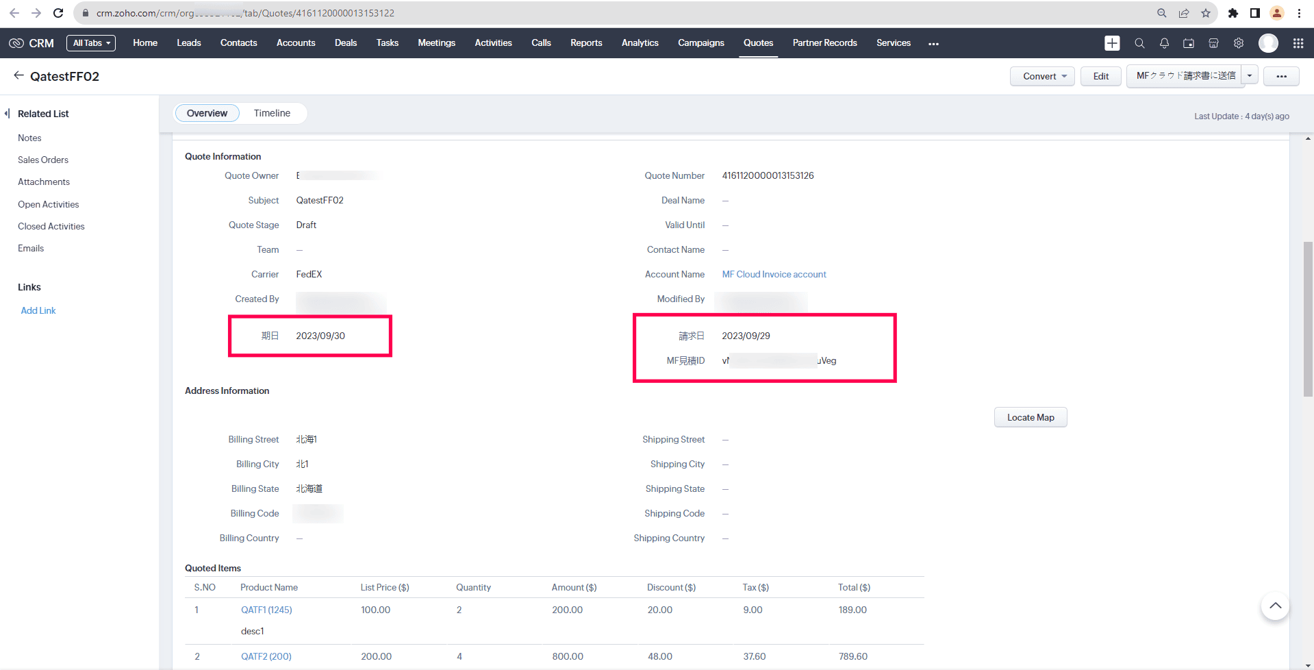 Odată ce o factură este creată în portalul MF Cloud, MF見積ID va fi actualizat.