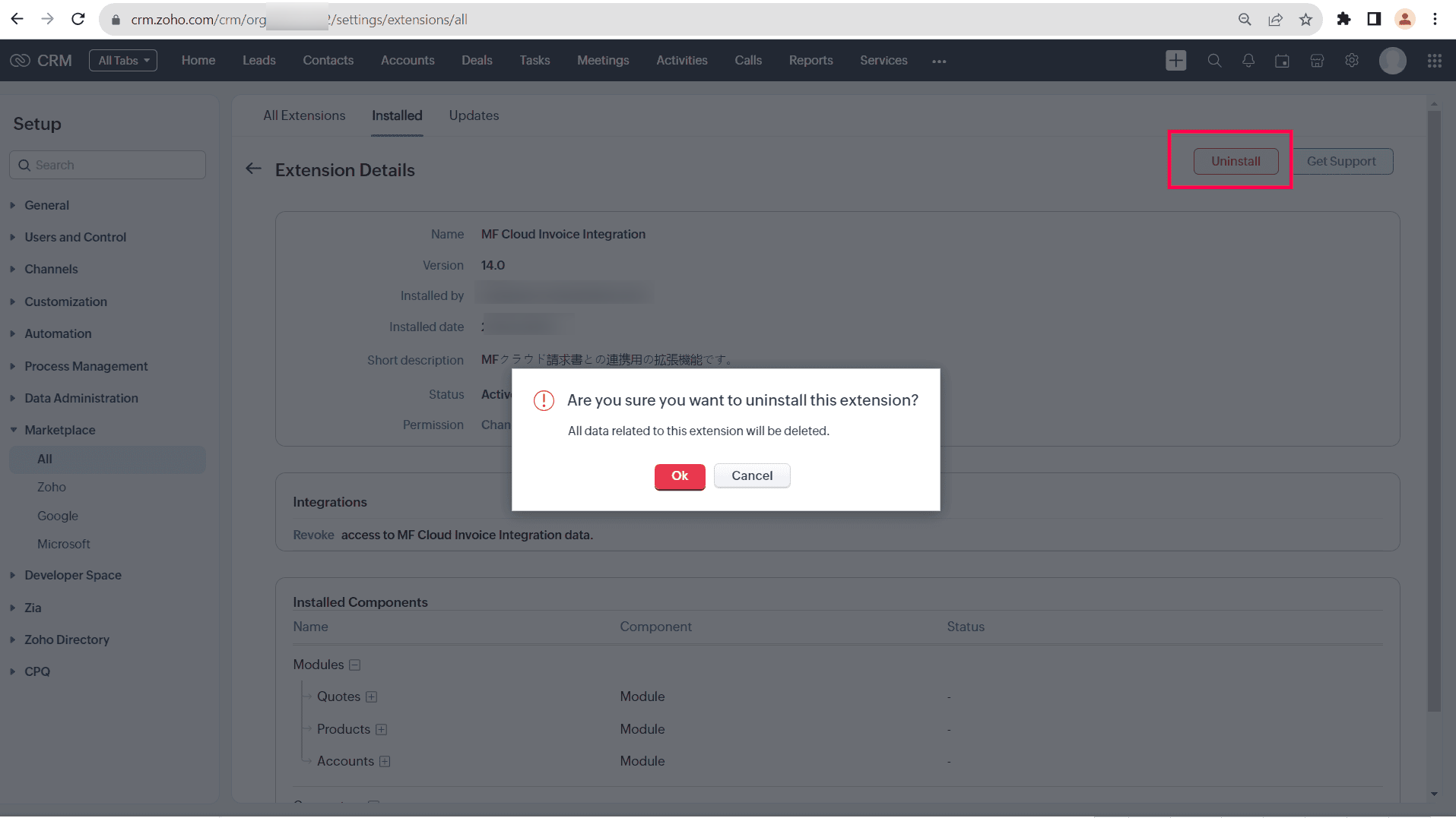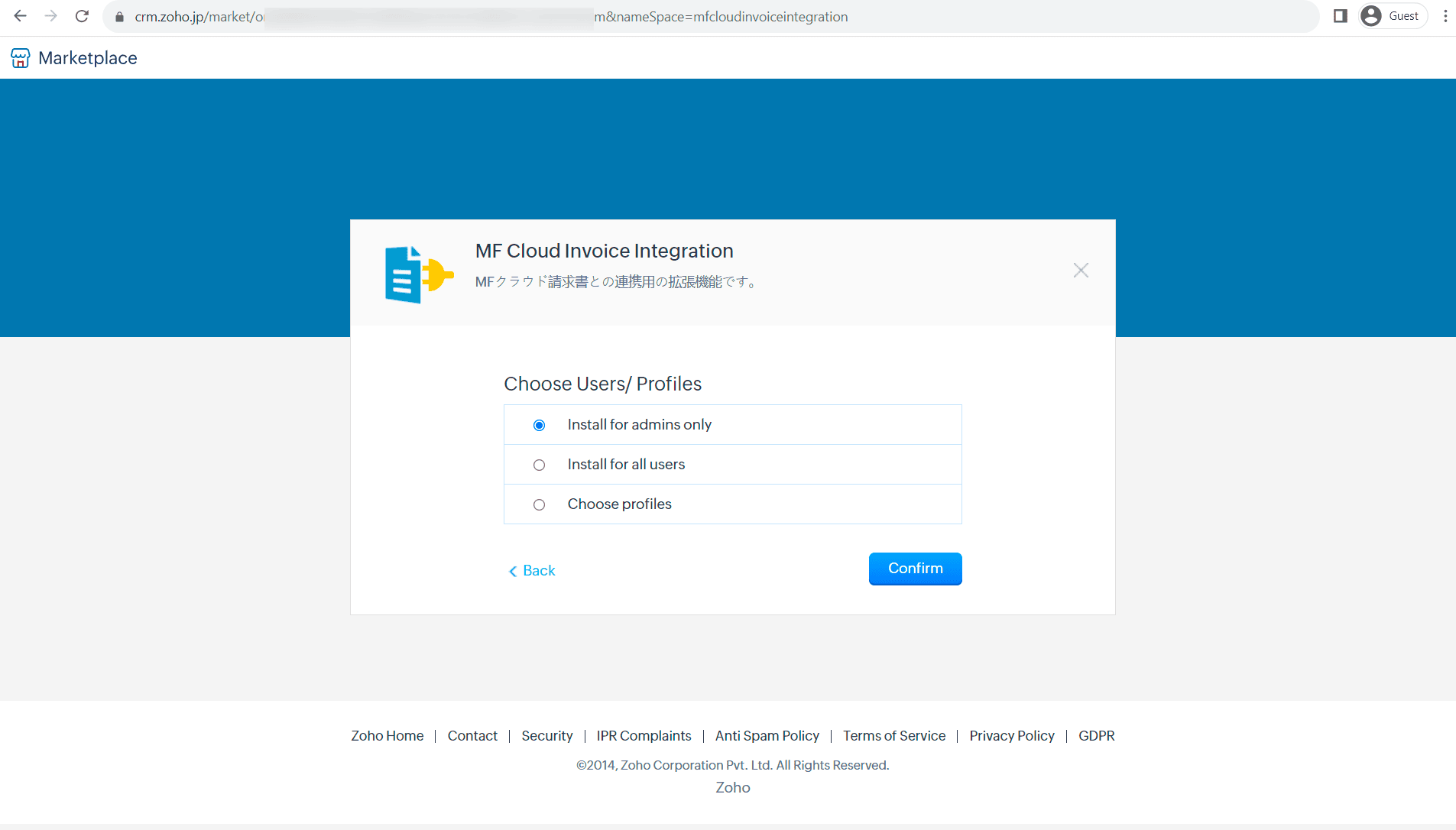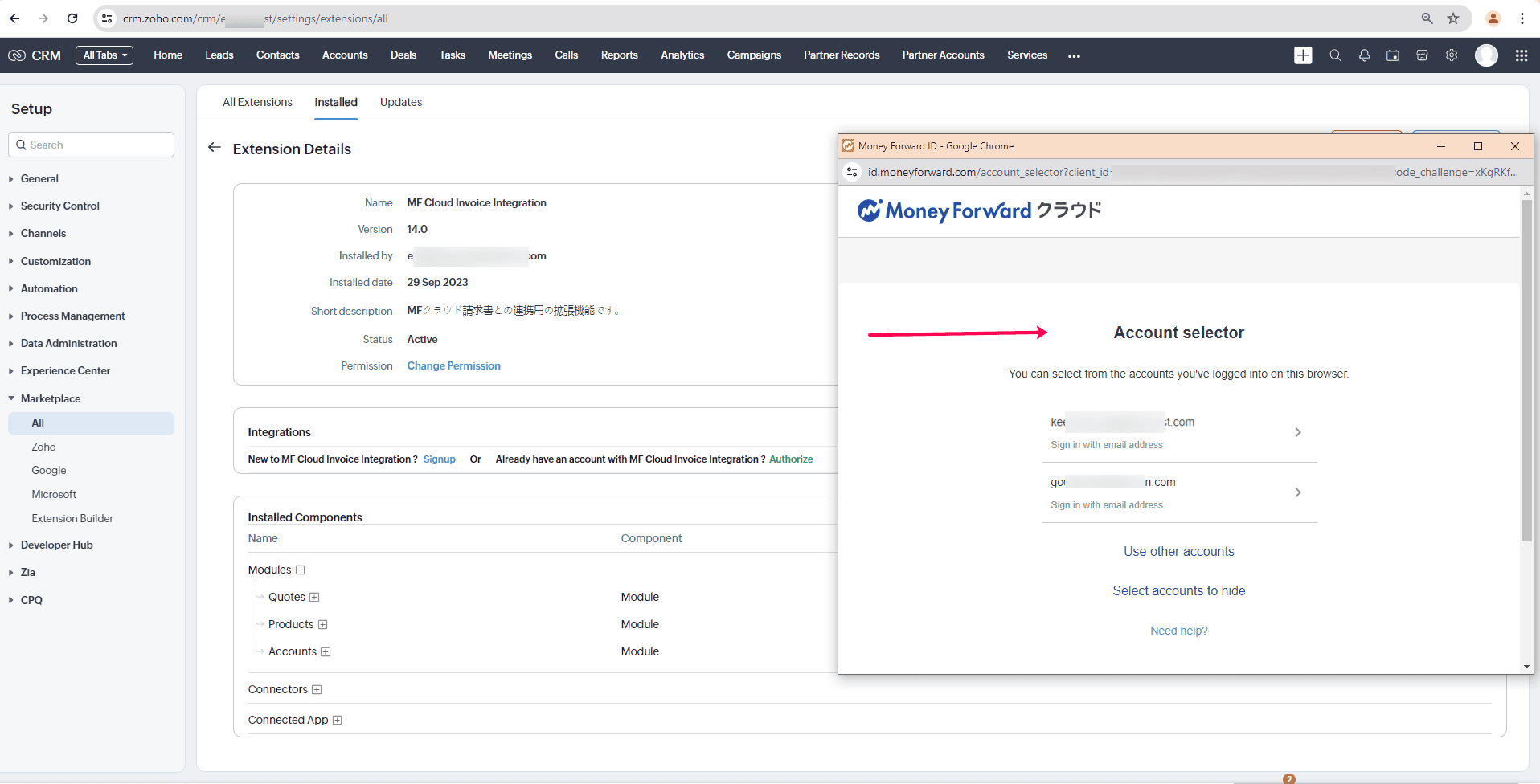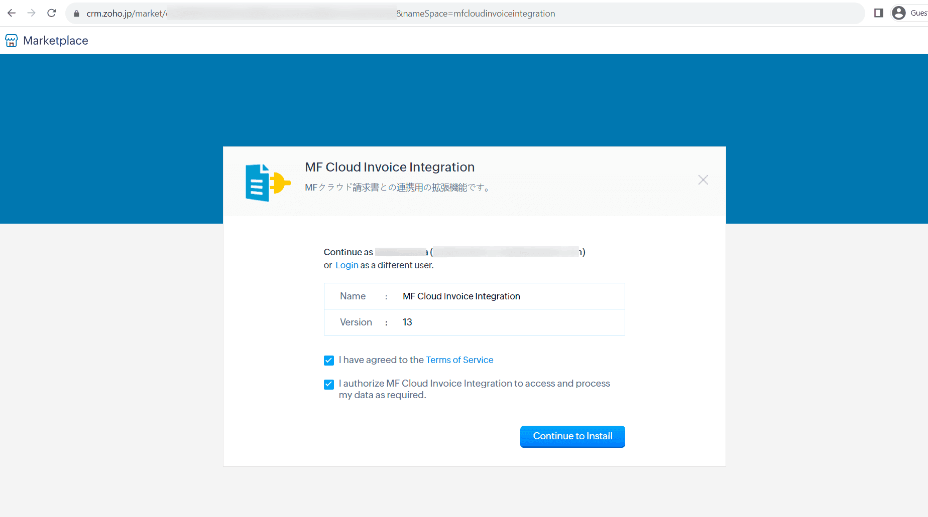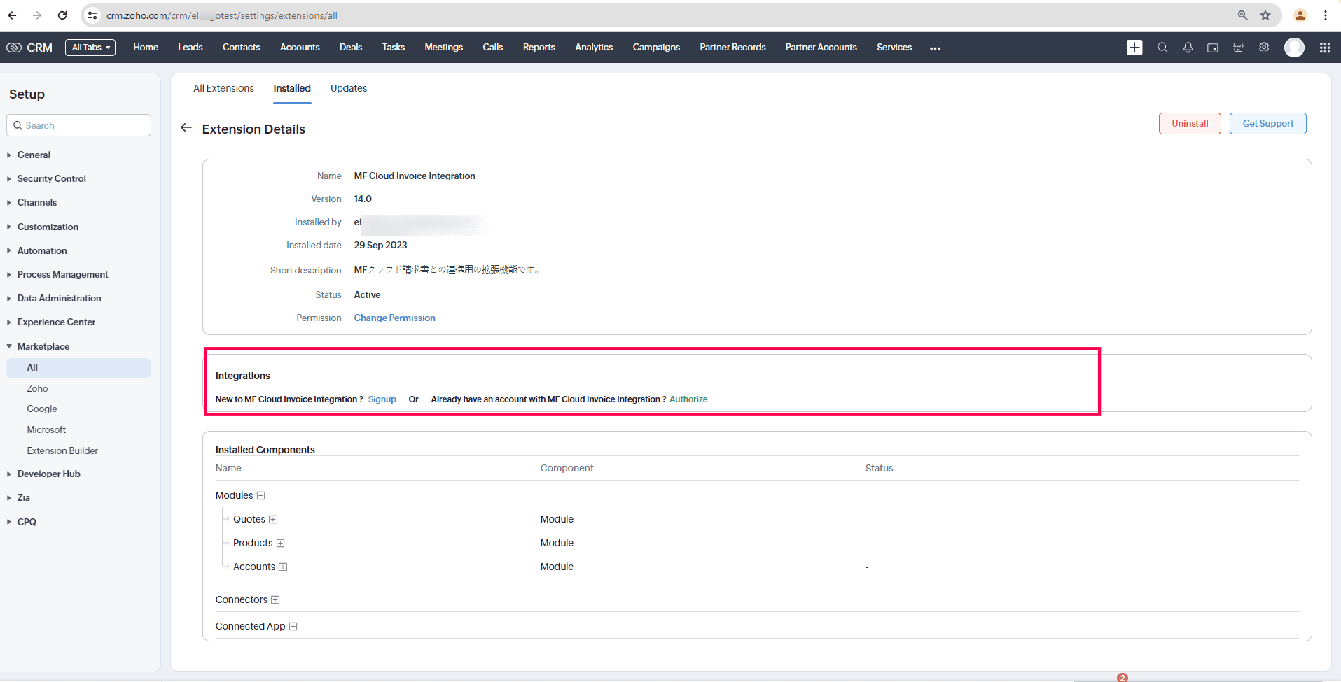 - Odată instalată, extensia MF Cloud Invoice trebuie autorizată pentru a integra portalul MF Cloud Invoice cu Zoho CRM.