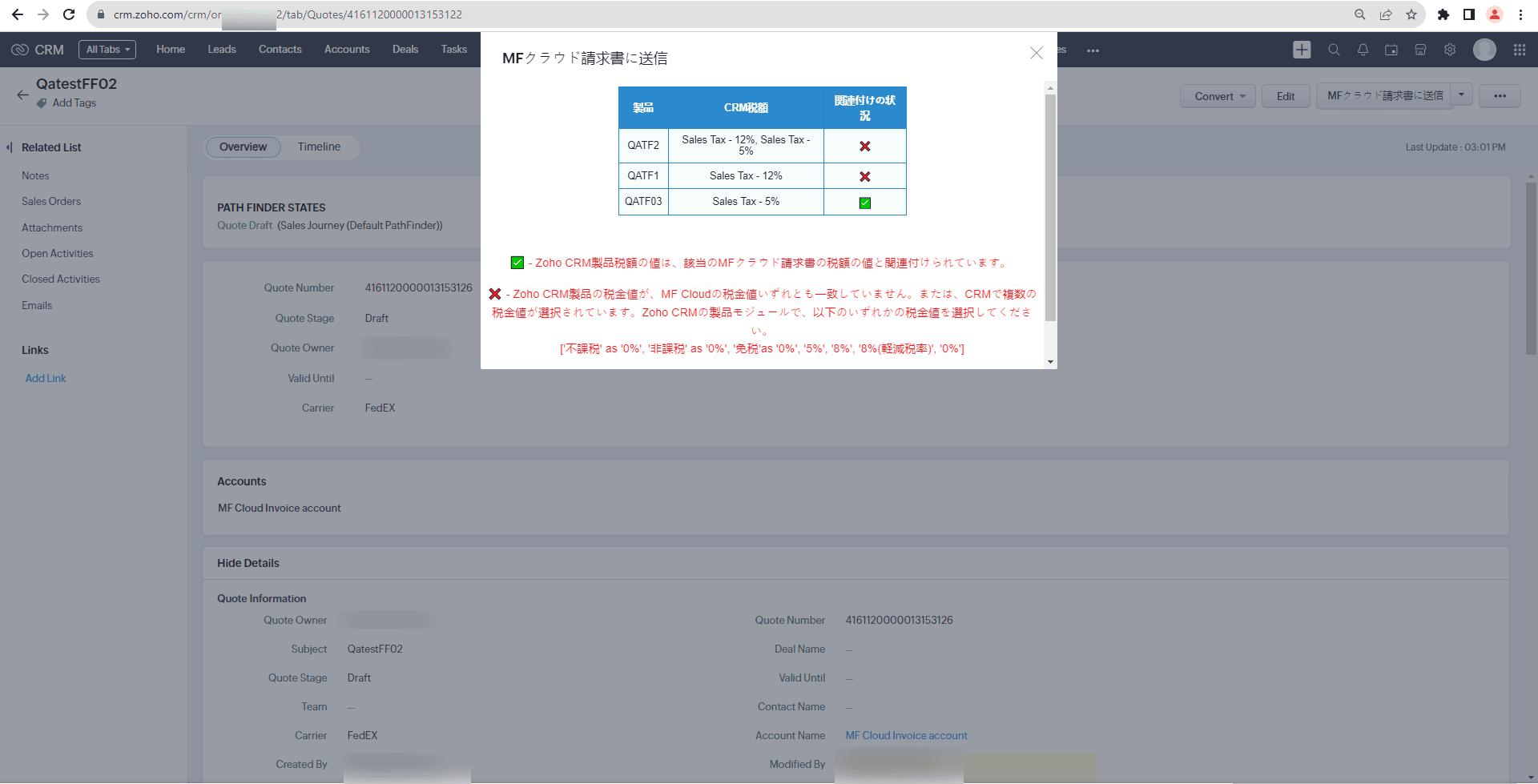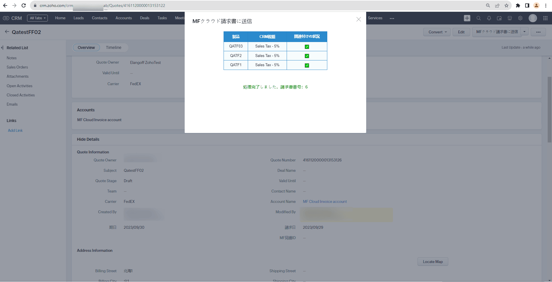 Dacă toate produsele Zoho CRM sunt mapate corect cu valorile de taxe corespunzătoare din MF Cloud, atunci ofertele vor fi create cu succes ca facturi în portalul MF Cloud Invoice.