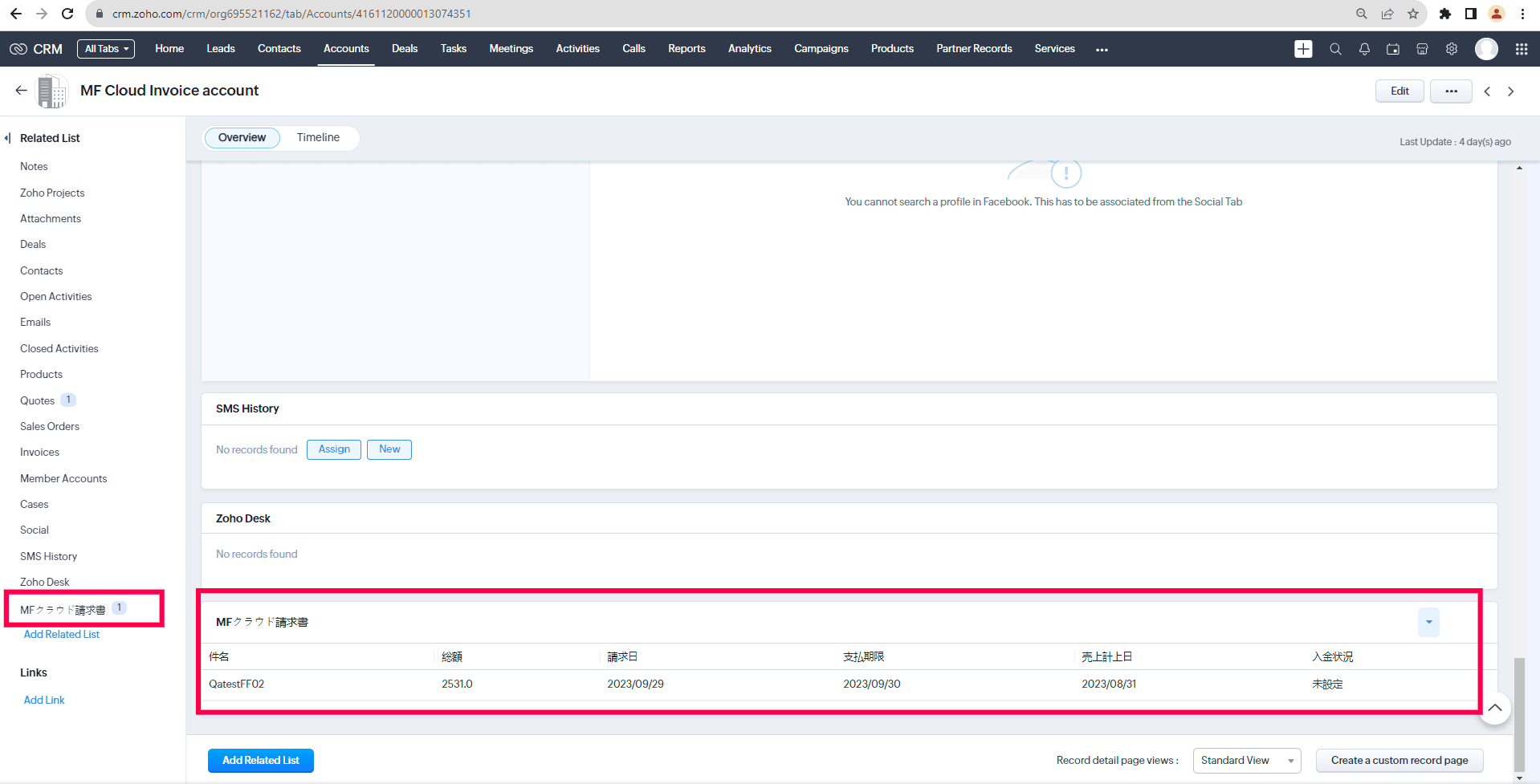 Pagina de vizualizare Accounts: Câmpuri personalizateFacturile asociate unui cont vor fi afișate în lista asociată "MFクラウド請求書" din modulul Accounts al Zoho CRM.