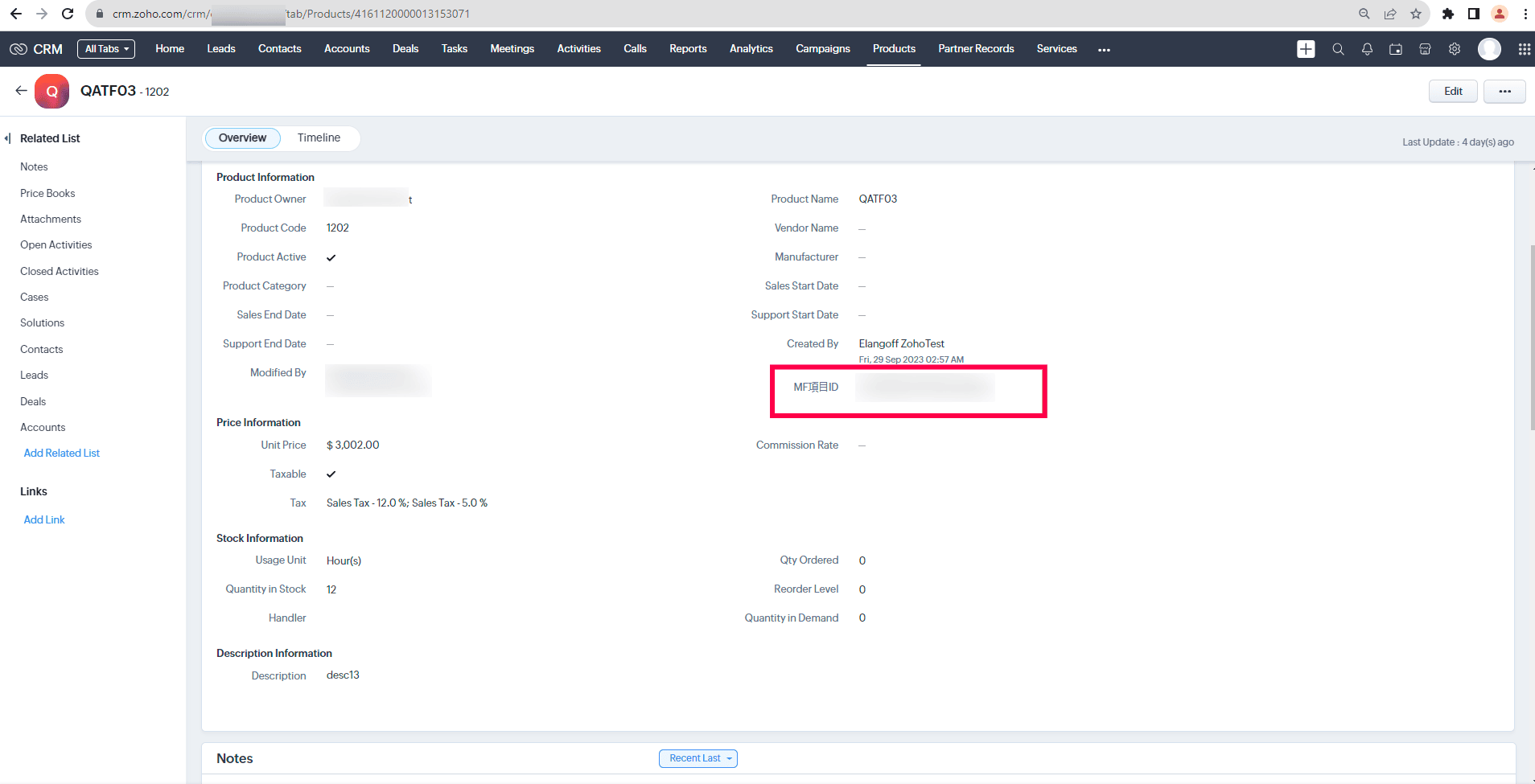 ID-ul corespunzător al articolului MF Cloud va fi actualizat în câmpul "MF項目ID" din Zoho CRM.