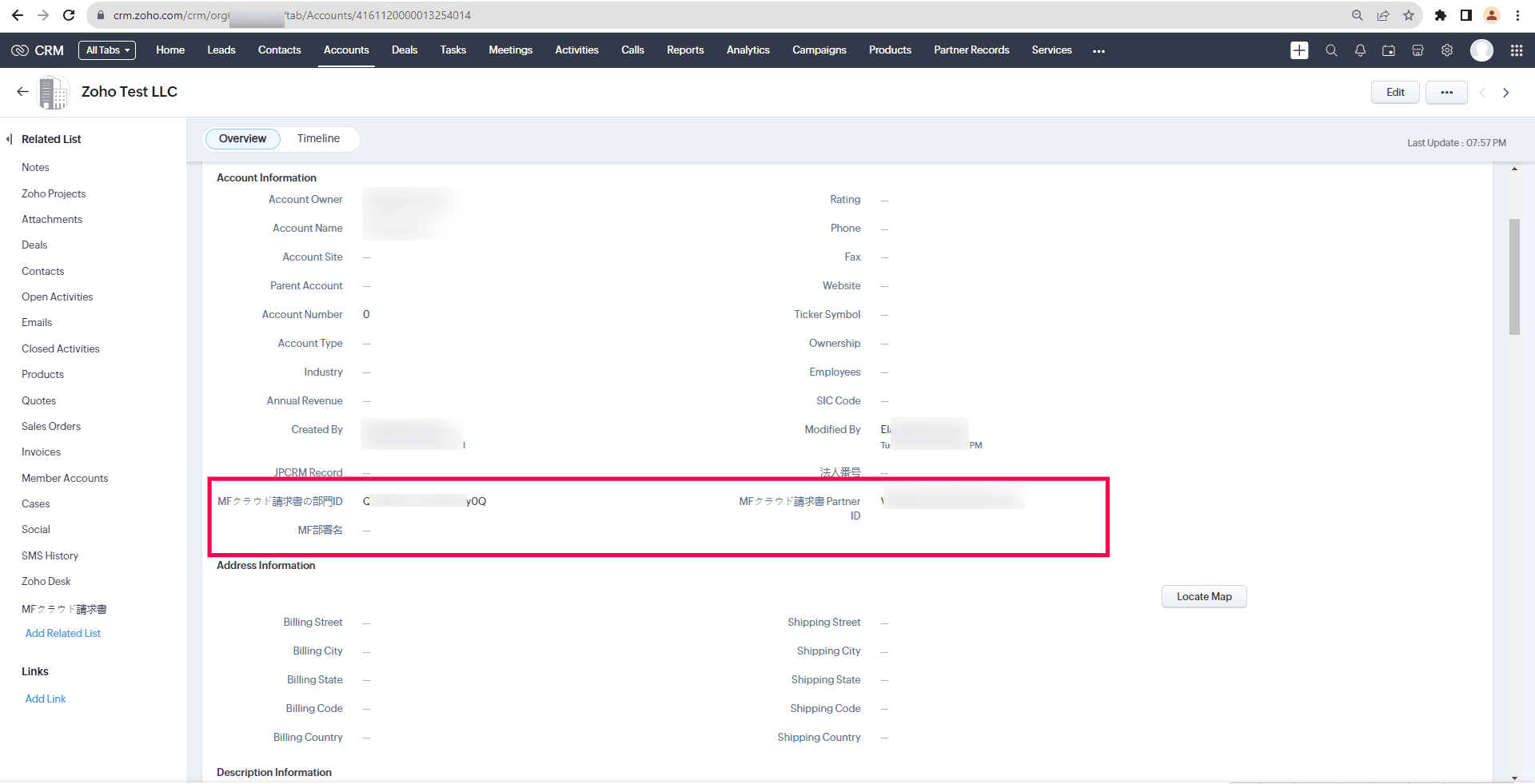 Câmpurile CRM sincronizate cu modulul MF Cloud Partners: Account Name, MF部署名, informații despre adresă.