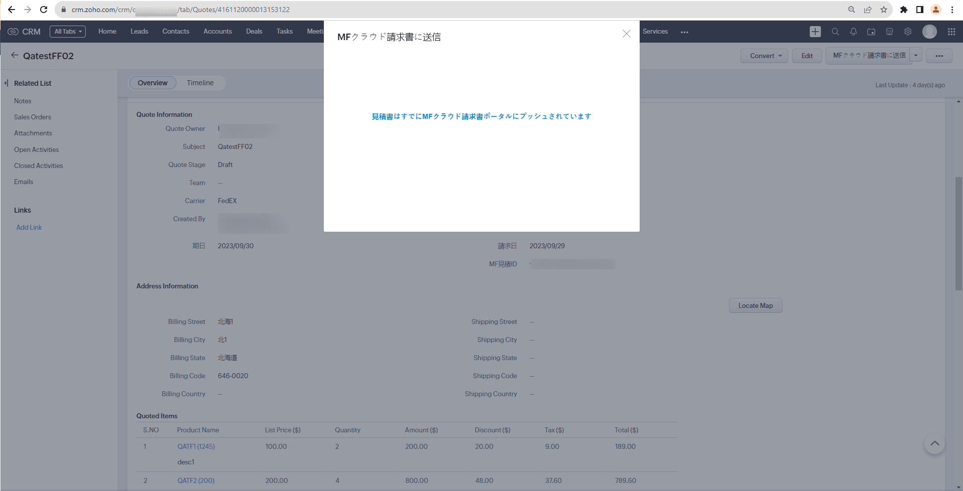 Dacă utilizatorul încearcă să creeze din nou o factură, va fi afișat un mesaj pop-up: "Already Created (見積書はすでにMFクラウド請求書ポータルにプッシュされています)".