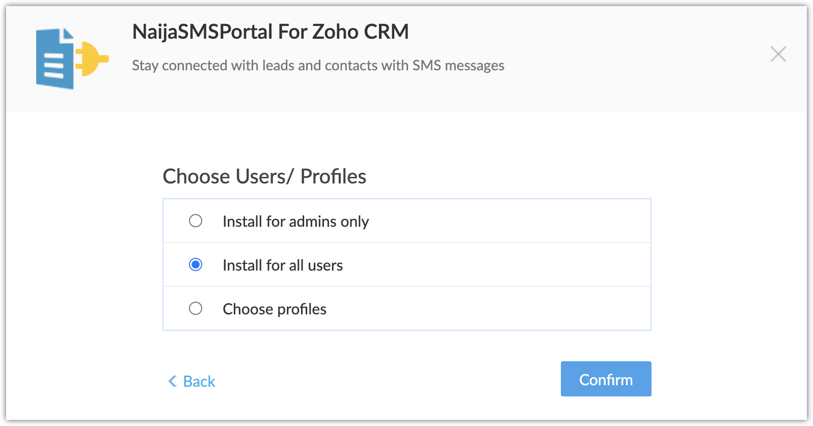 - Choose profiles - Extensia va fi instalată în CRM doar pentru utilizatorii selectați. Alege această opțiune, apasă Continue, apoi selectează profilurile.