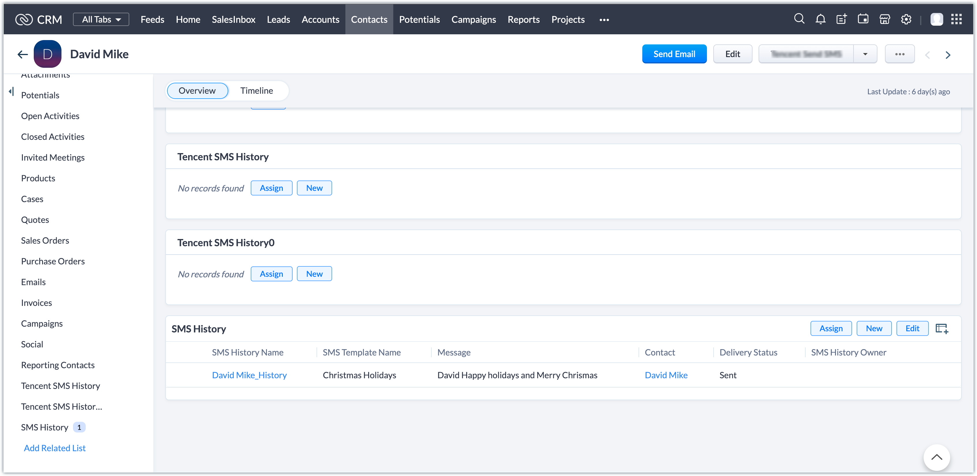 - Detaliile despre toate mesajele SMS trimise către lead sau contact vor fi listate în lista asociată SMS History.