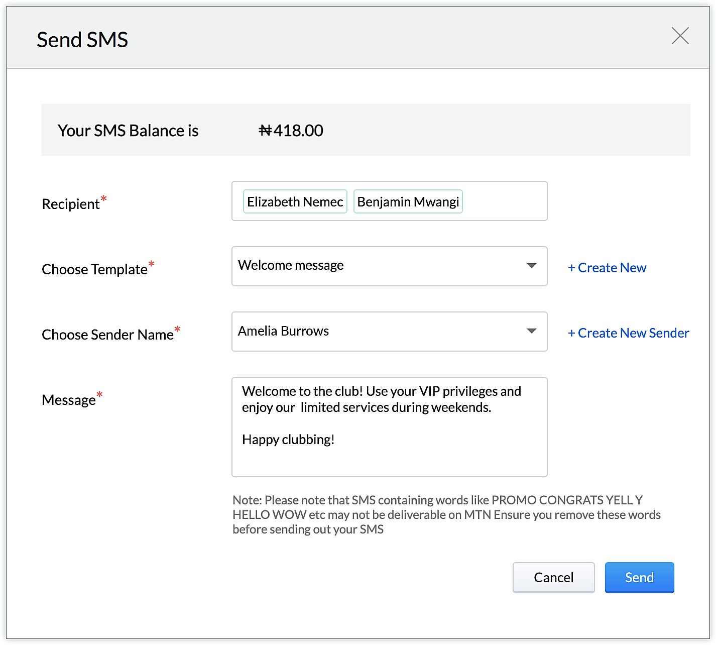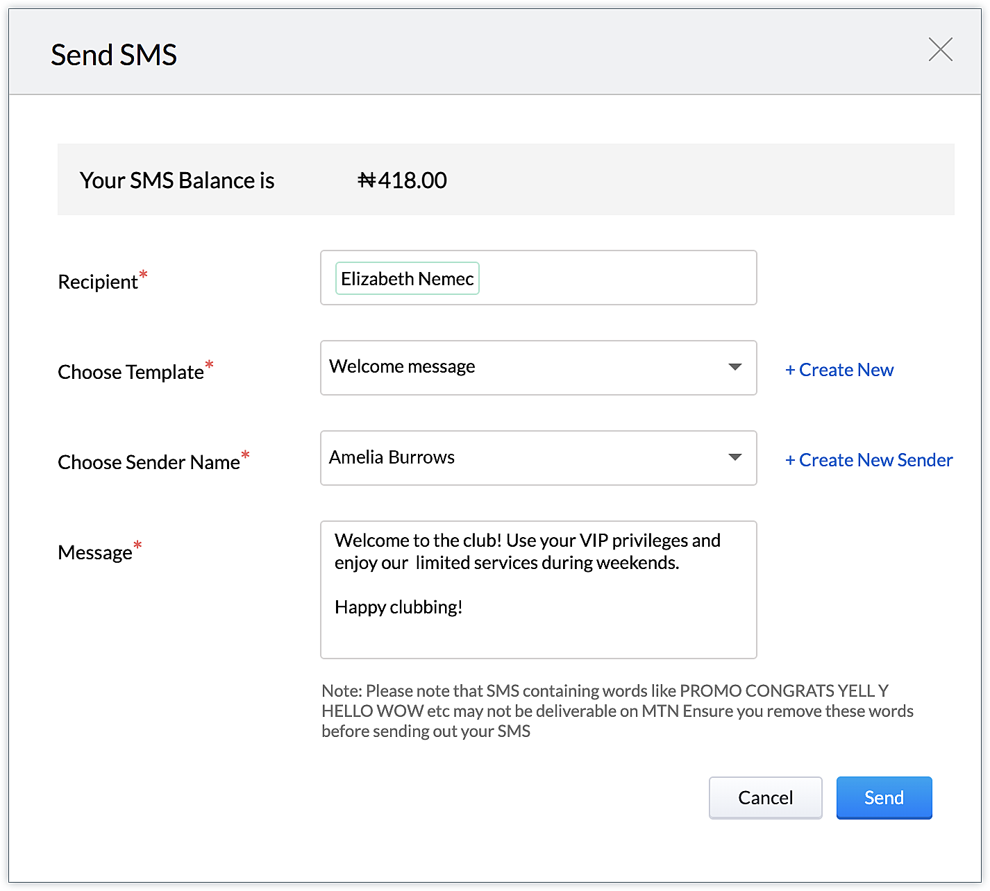 Toate șabloanele SMS create vor fi listate aici. - Selectează numele expeditorului dorit din dropdown-ul Choose Sender Name. Dacă nu este disponibil niciun expeditor, apasă Create New Sender.