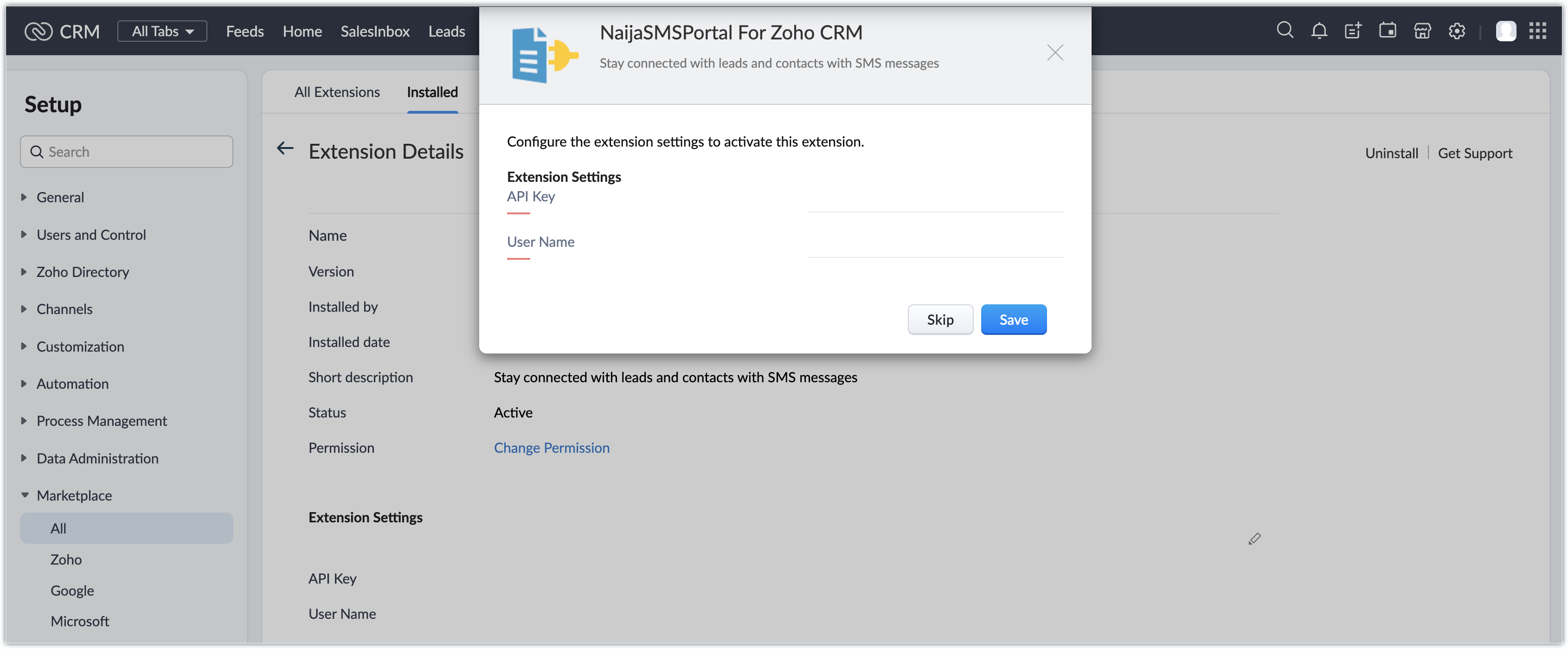 Dacă apeși Skip în acest pas, poți configura mai târziu din Setup > Marketplace > All > Installed Extensions. Caută extensia NaijaSMSPortal și apasă Configure.