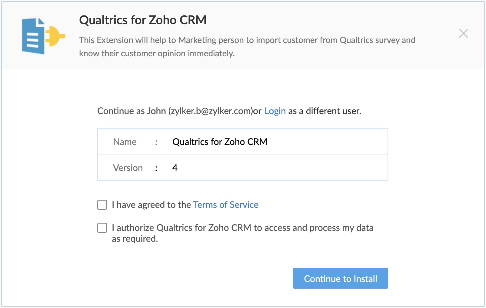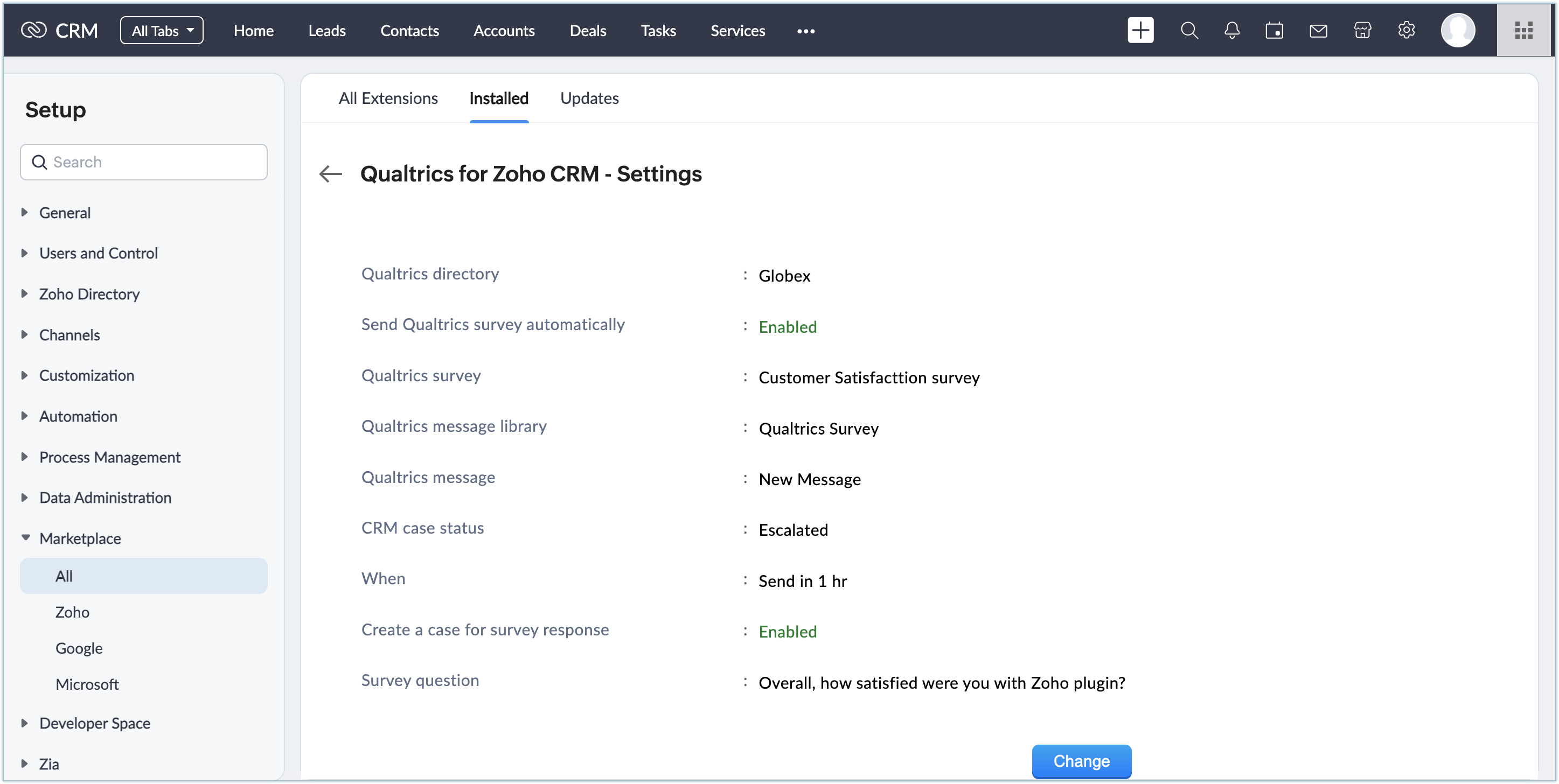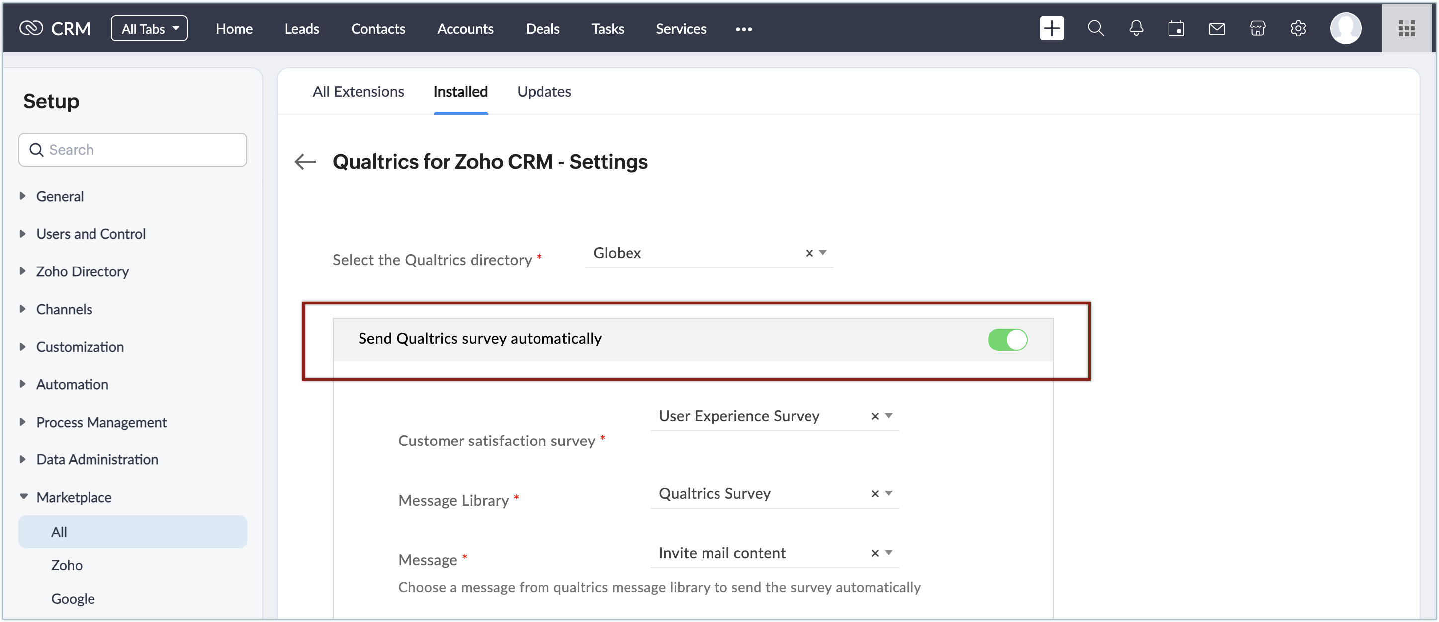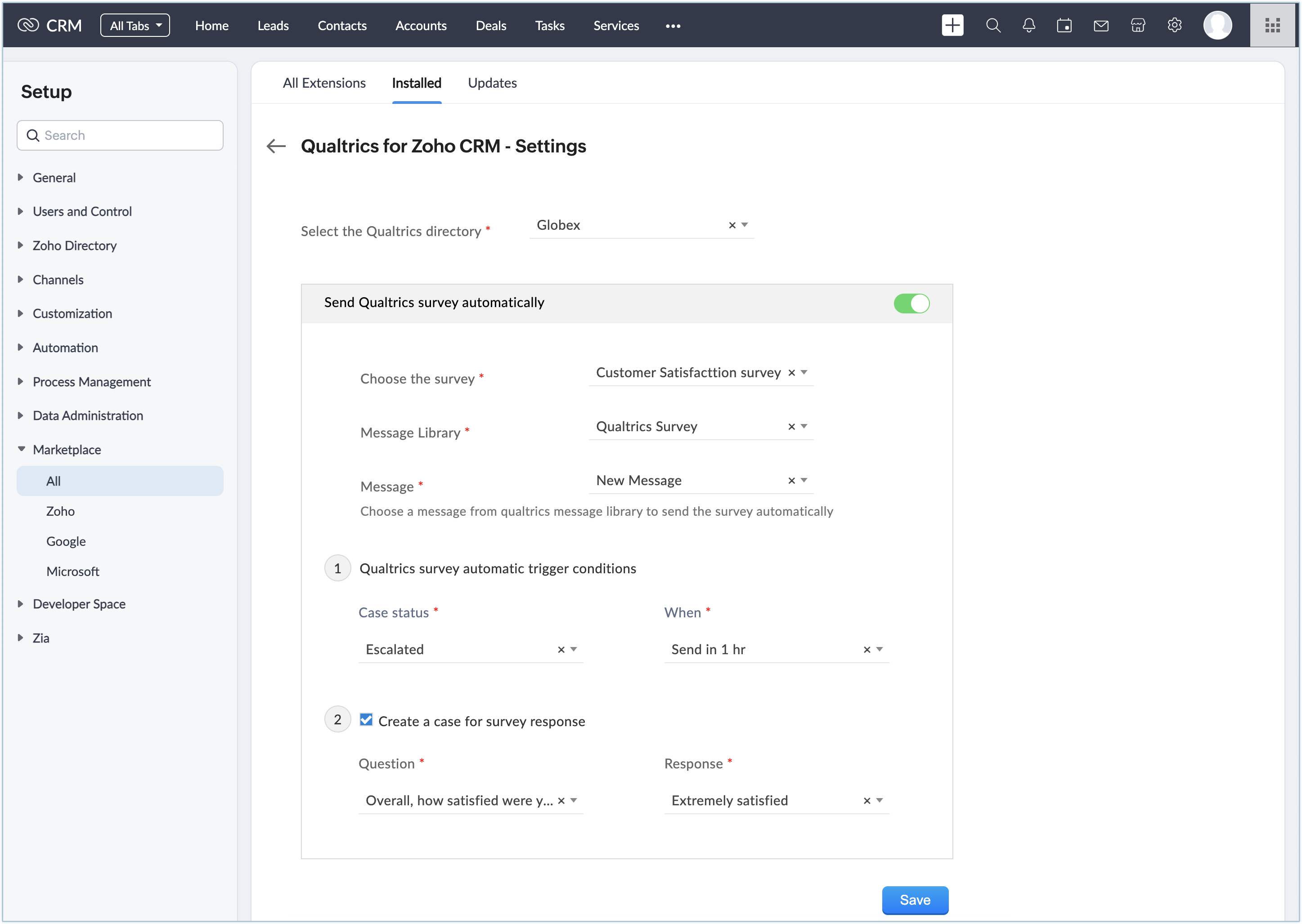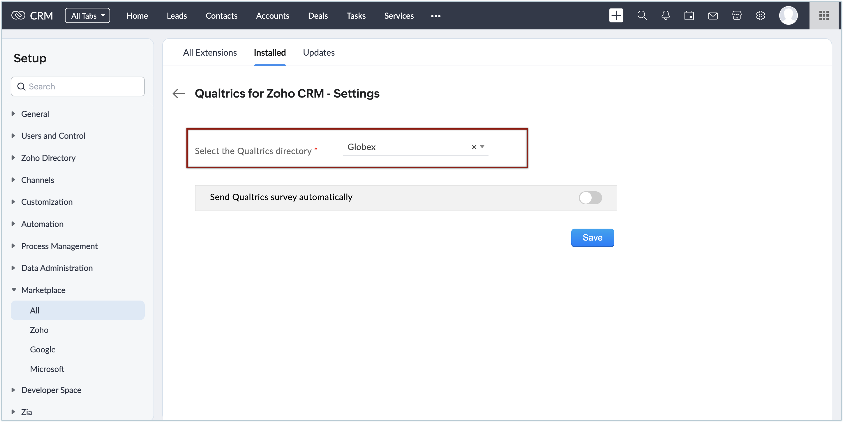 Poți instala extensia Qualtrics din Zoho Marketplace sau din contul tău Zoho CRM.