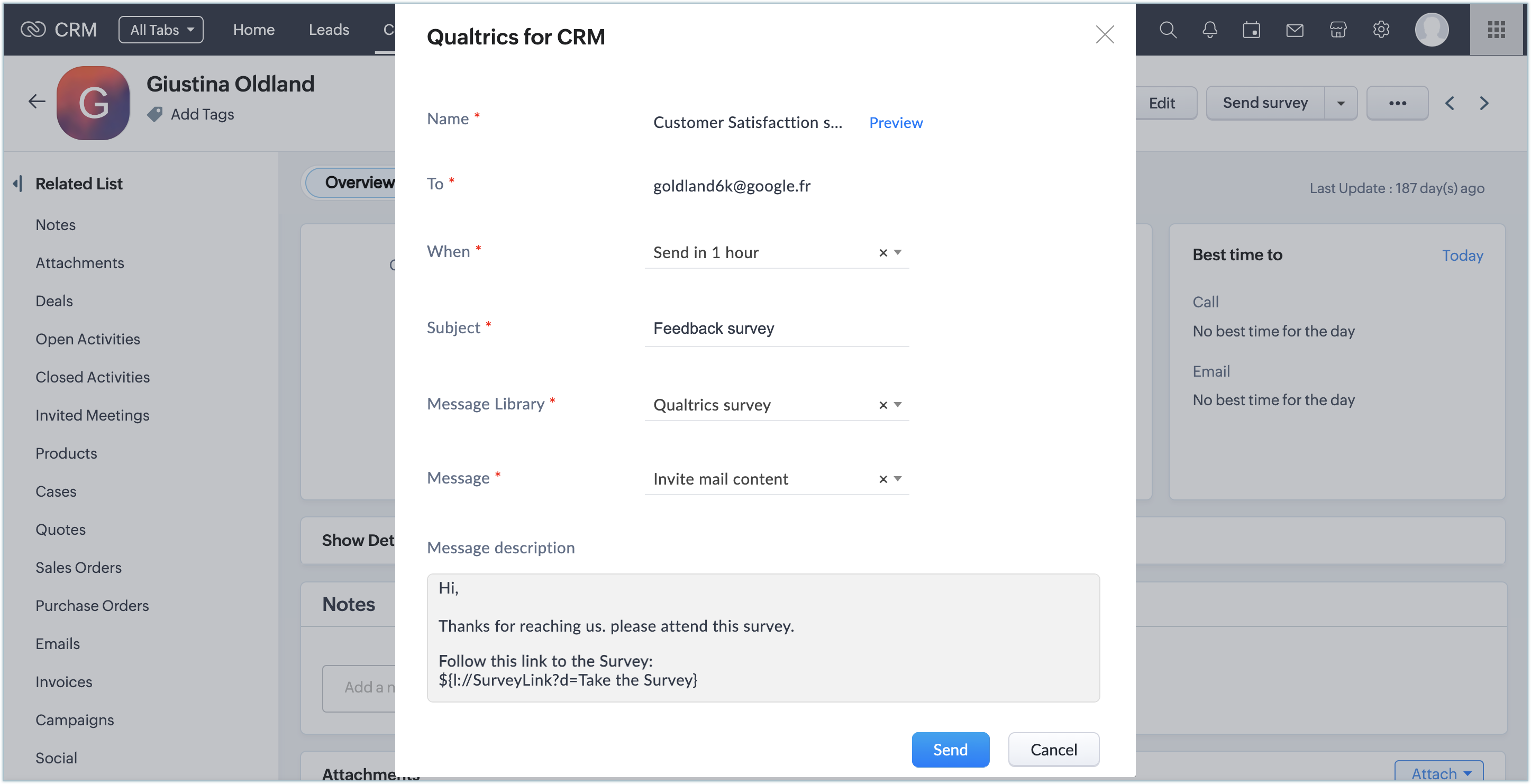 Poți opta să trimiți sondaje Qualtrics clienților tăi automat cu condiții definite. Ori de câte ori condițiile definite sunt îndeplinite, un sondaj Qualtrics corespunzător va fi trimis clientului din Zoho CRM.