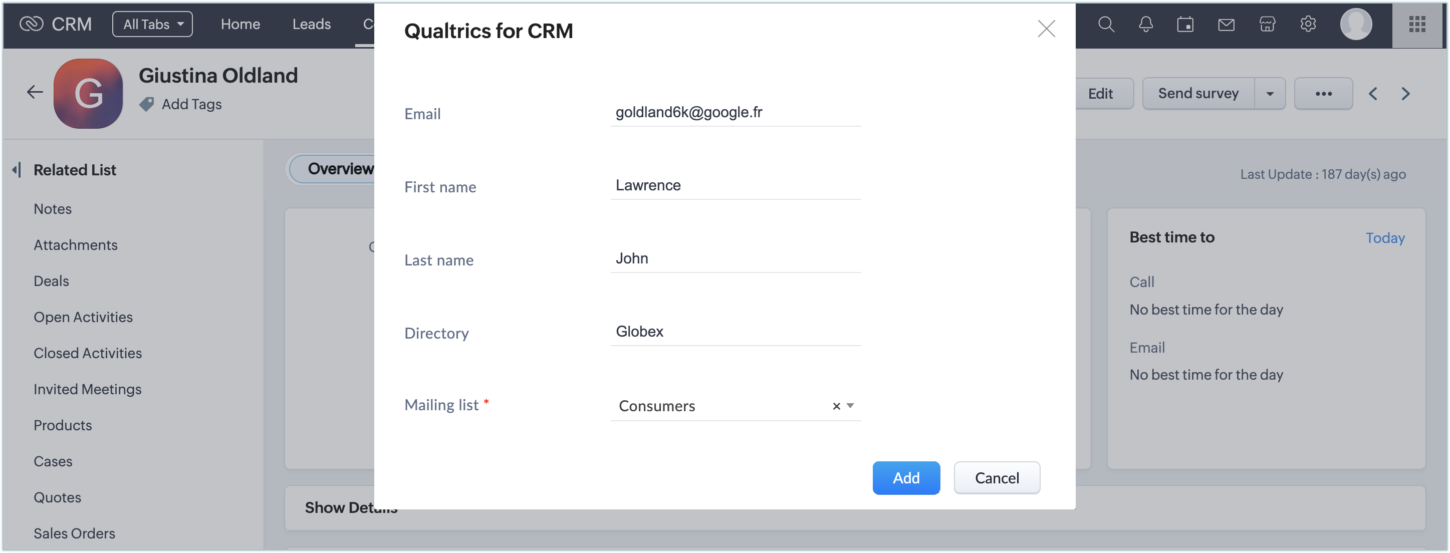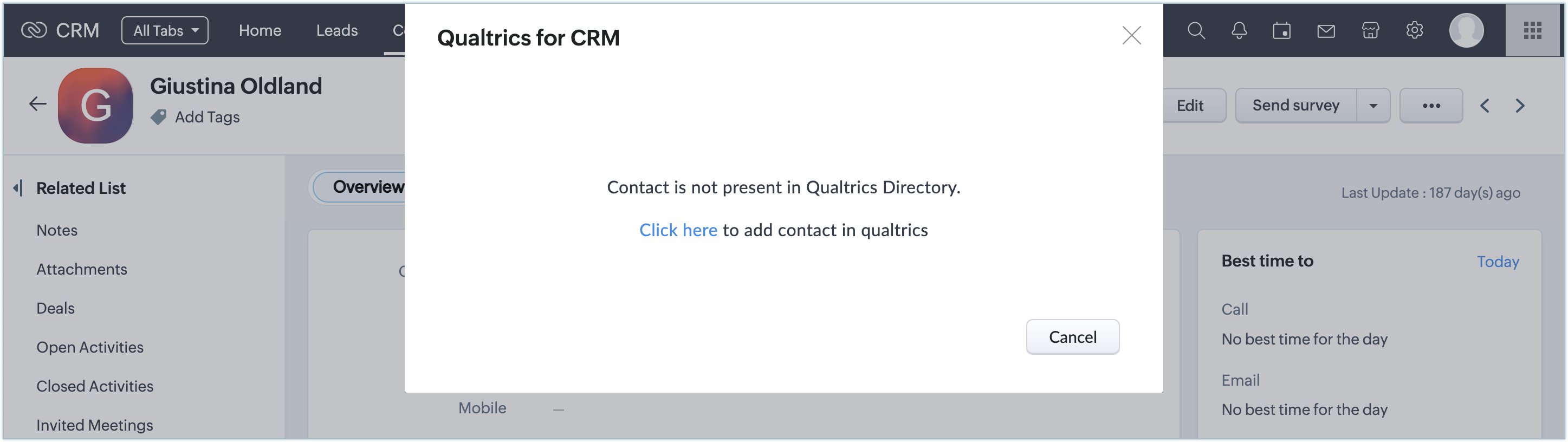 Ori de câte ori încerci să trimiți un sondaj din modulul Contacts unui client care nu se află în înregistrările tale Qualtrics, extensia va identifica clientul după adresa de e-mail și te va notifica printr-un pop-up.