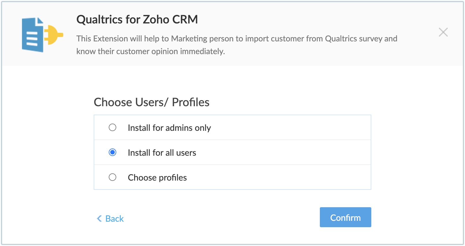 - Choose profiles: Extensia va fi instalată în CRM pentru utilizatorii selectați manual. După ce alegi această opțiune și faci clic pe Confirm, poți selecta profilurile dorite.
