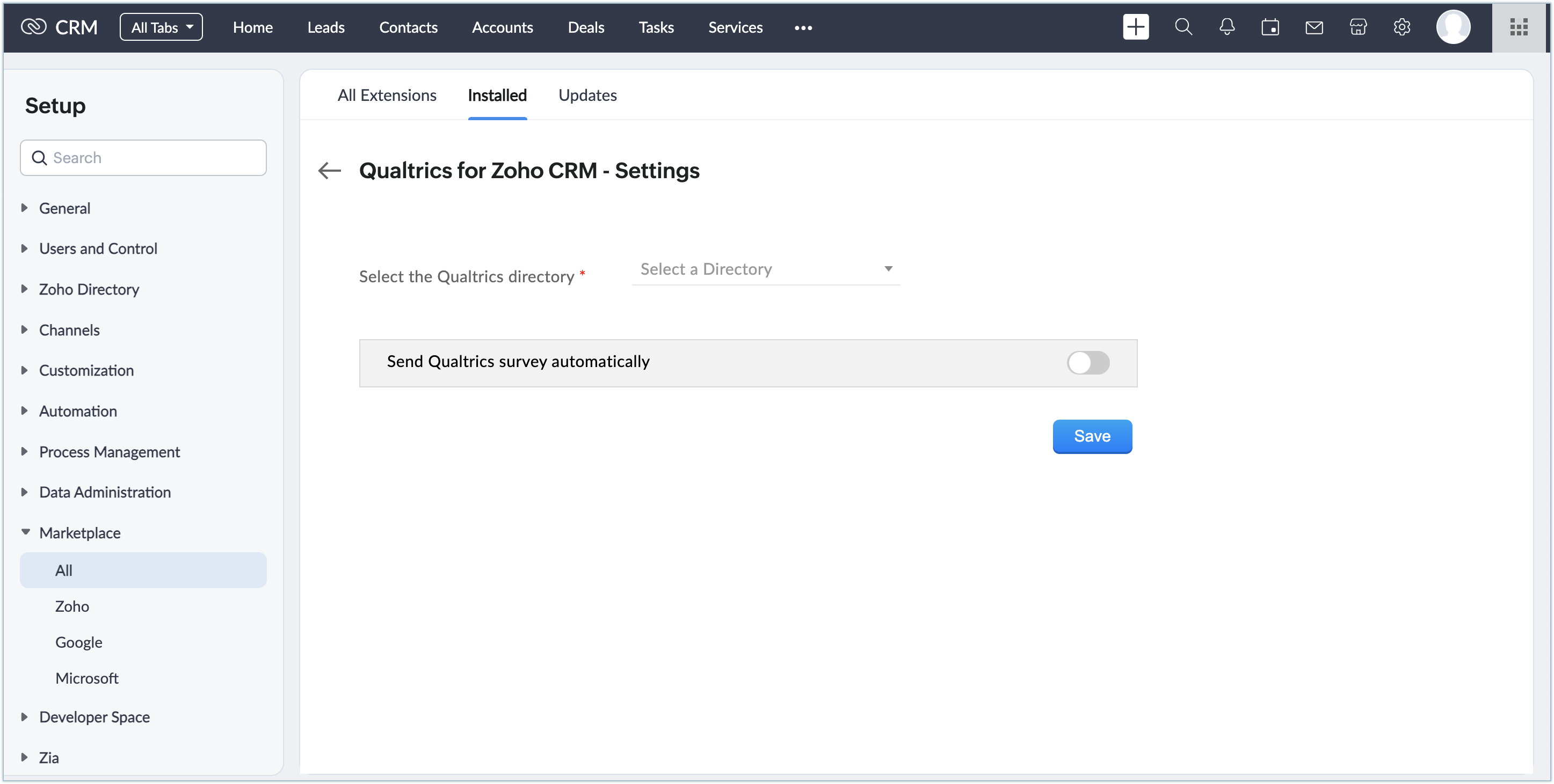 Odată ce extensia este instalată, trebuie să configurezi un director Qualtrics. Sondajele vor fi preluate doar din directorul selectat. Tot feedback-ul de la clienți va fi stocat în acel director, iar toate înregistrările din Zoho CRM vor fi trimise către acel director în Qualtrics.