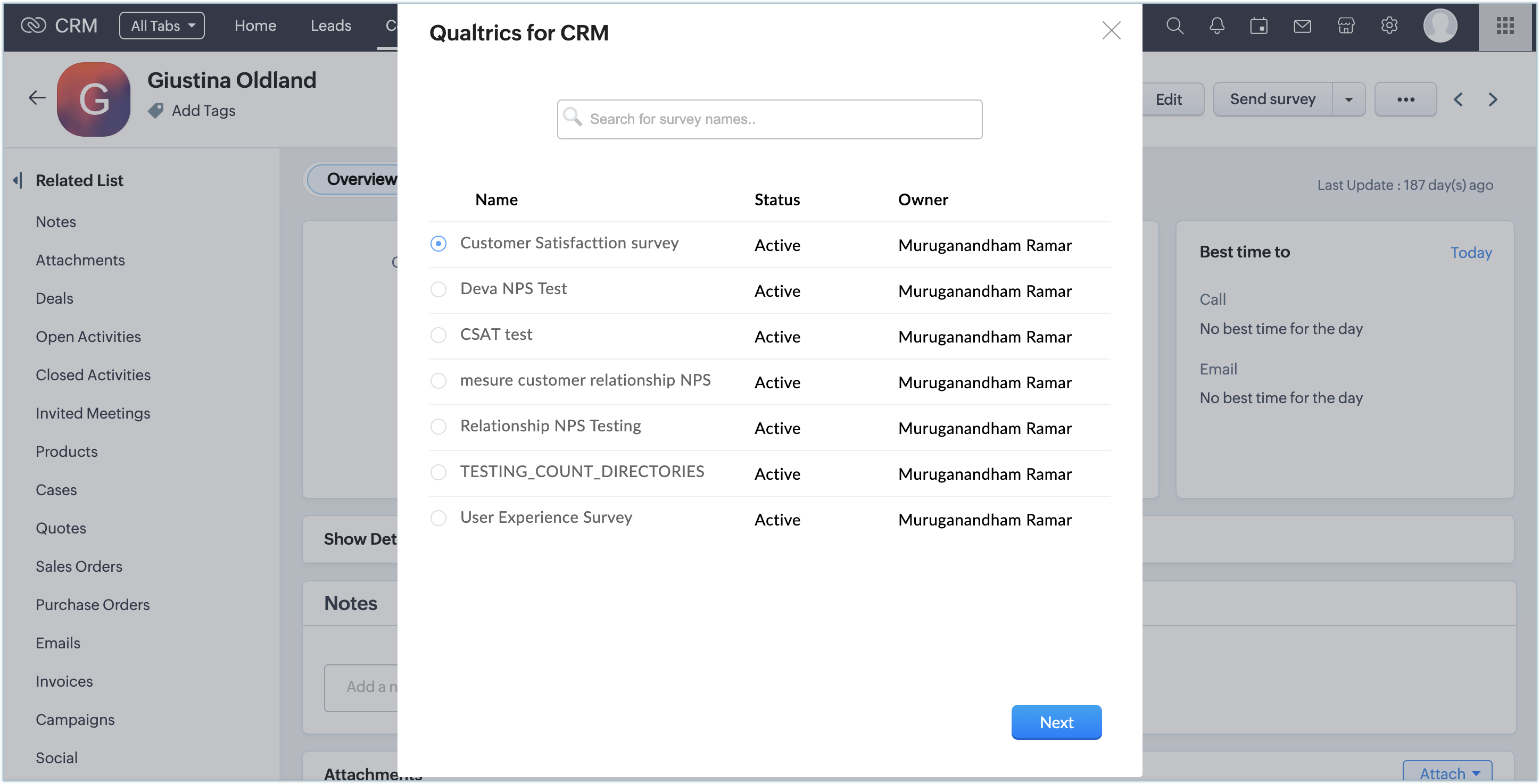 - În fereastra pop-up, selectează un sondaj și fă clic pe Next.
