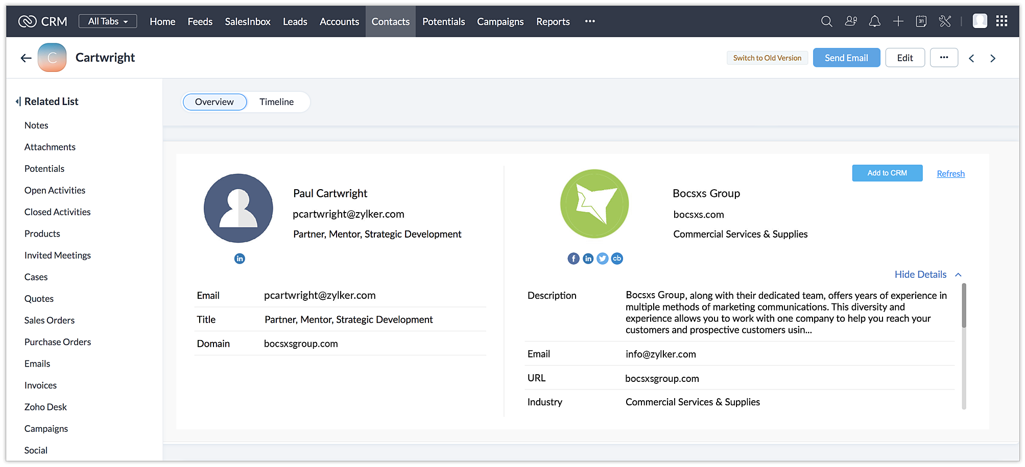 - Deschide o înregistrare în modulul Leads sau Contacts.