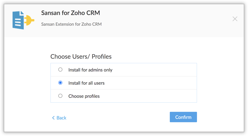 - Choose profiles - Extensia va fi instalată în CRM pentru utilizatorii aleși manual. Alege această opțiune, apasă pe Confirm, apoi selectează profilurile dorite.