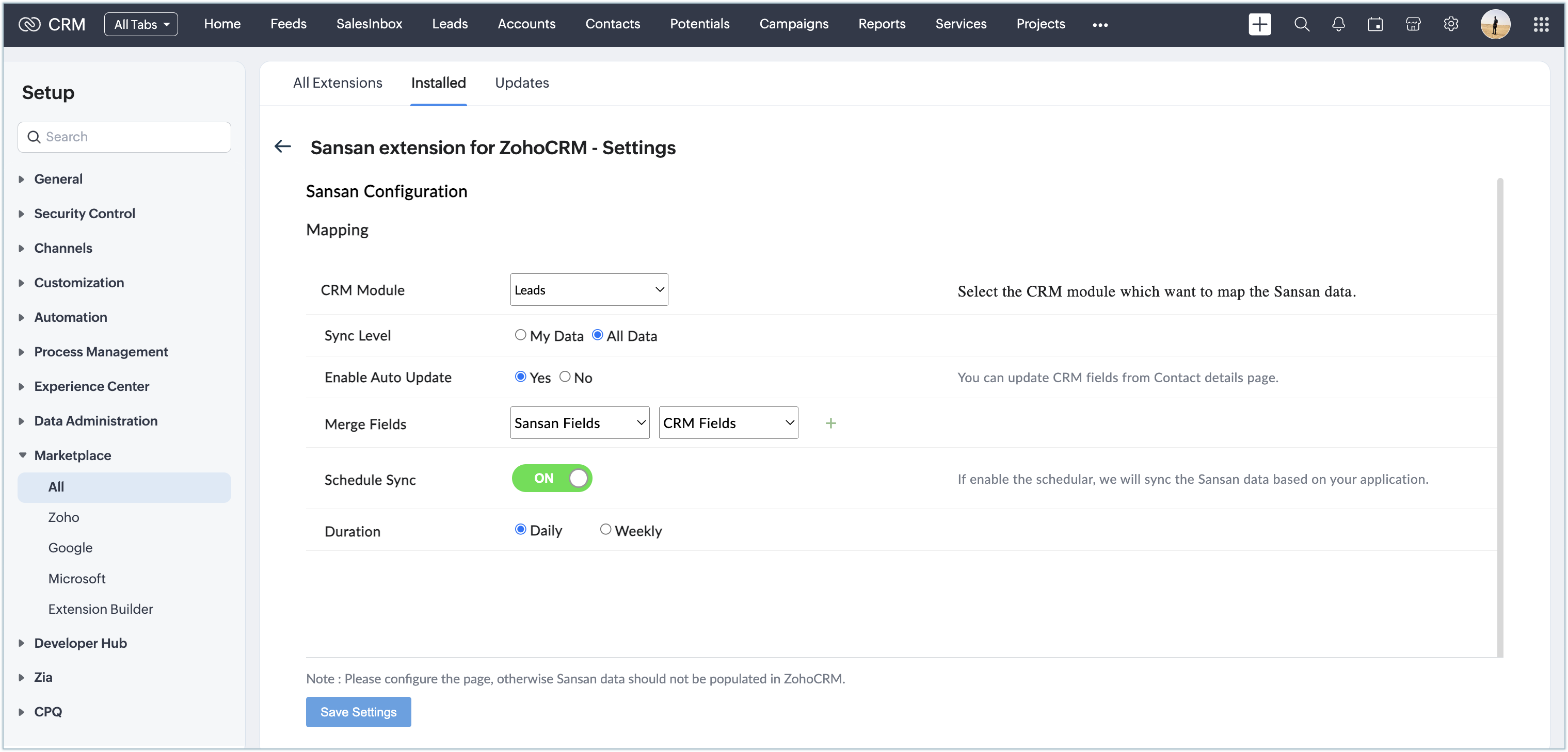 - Dacă omiti acest pas, poți autoriza mai târziu din pagina ta de Setup în Zoho CRM. Pentru aceasta, mergi la Setup, apoi selectează Marketplace sub All. Găsește extensia Sansan și apasă pe Configure.