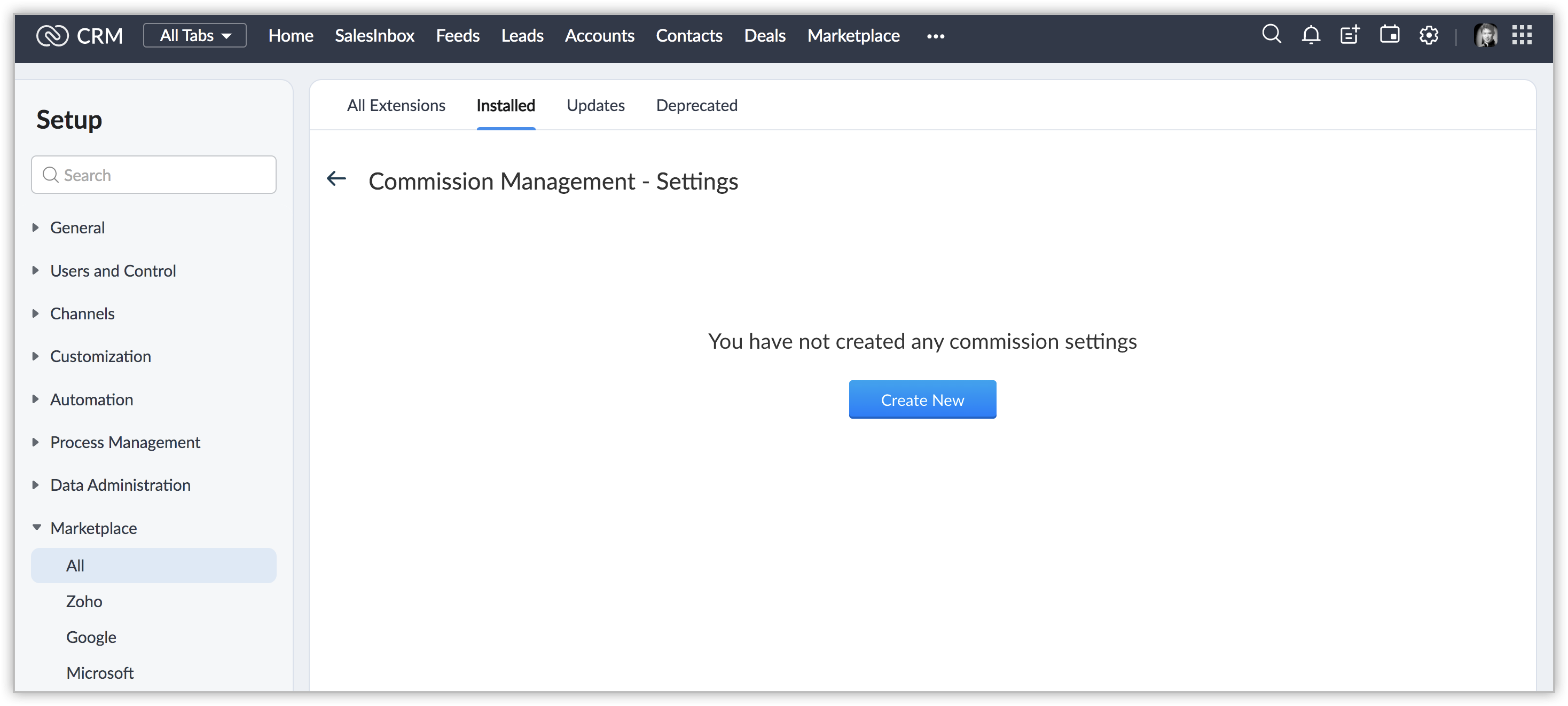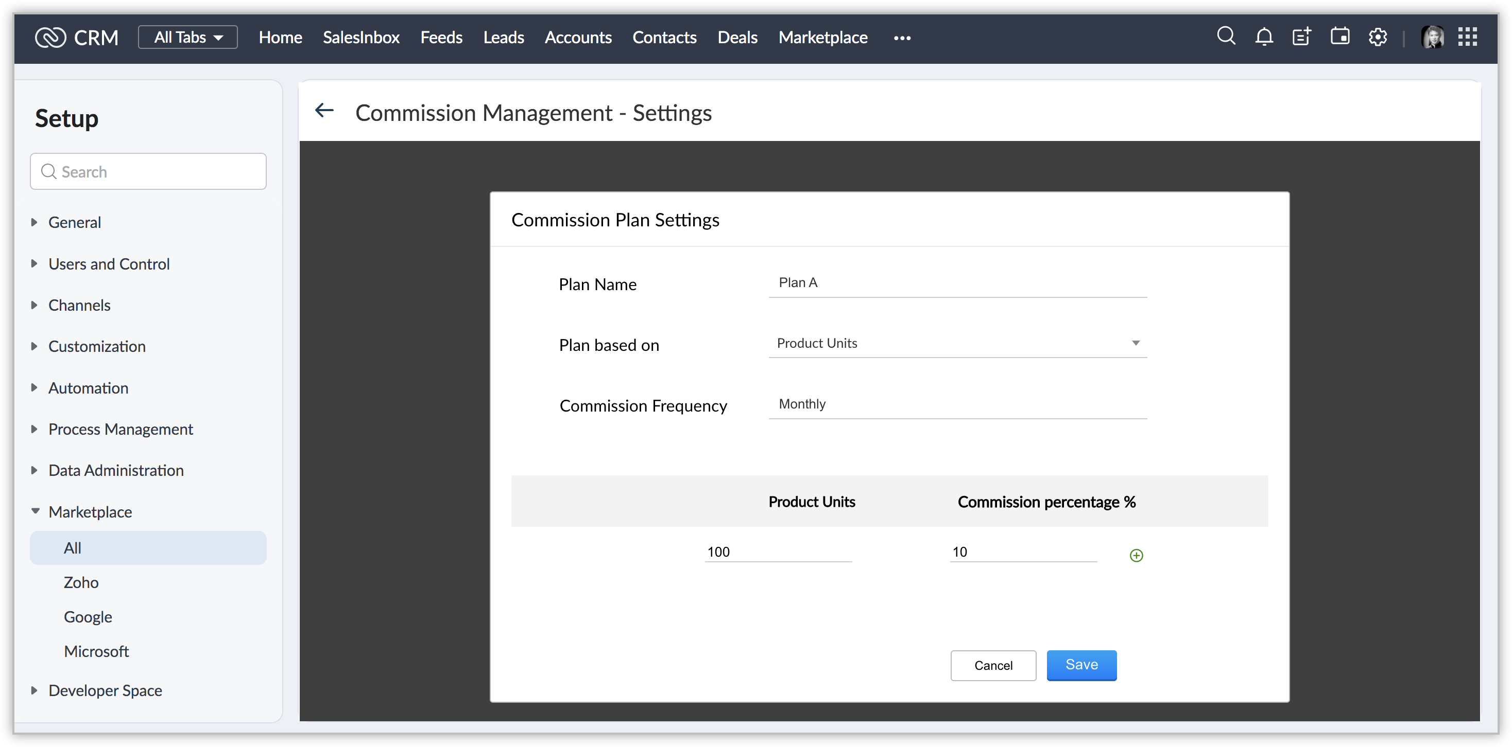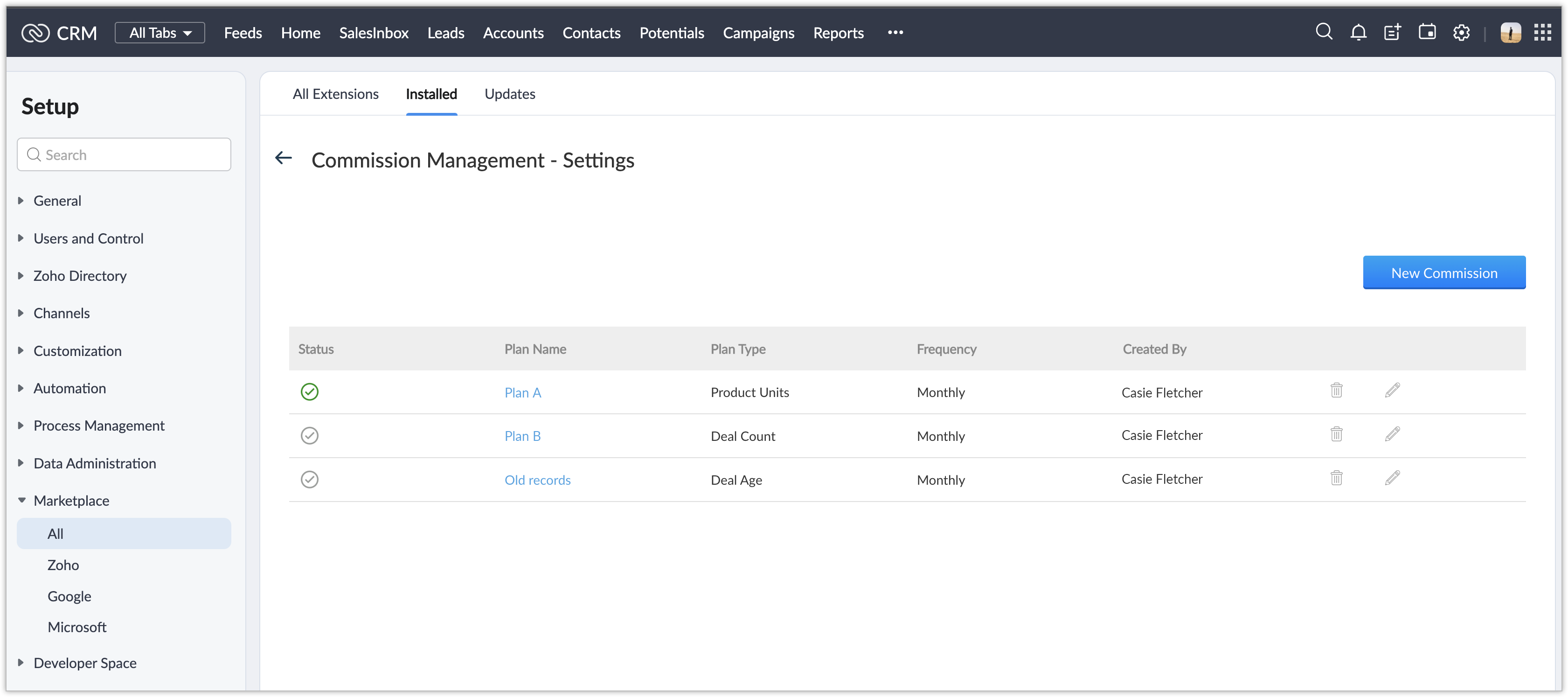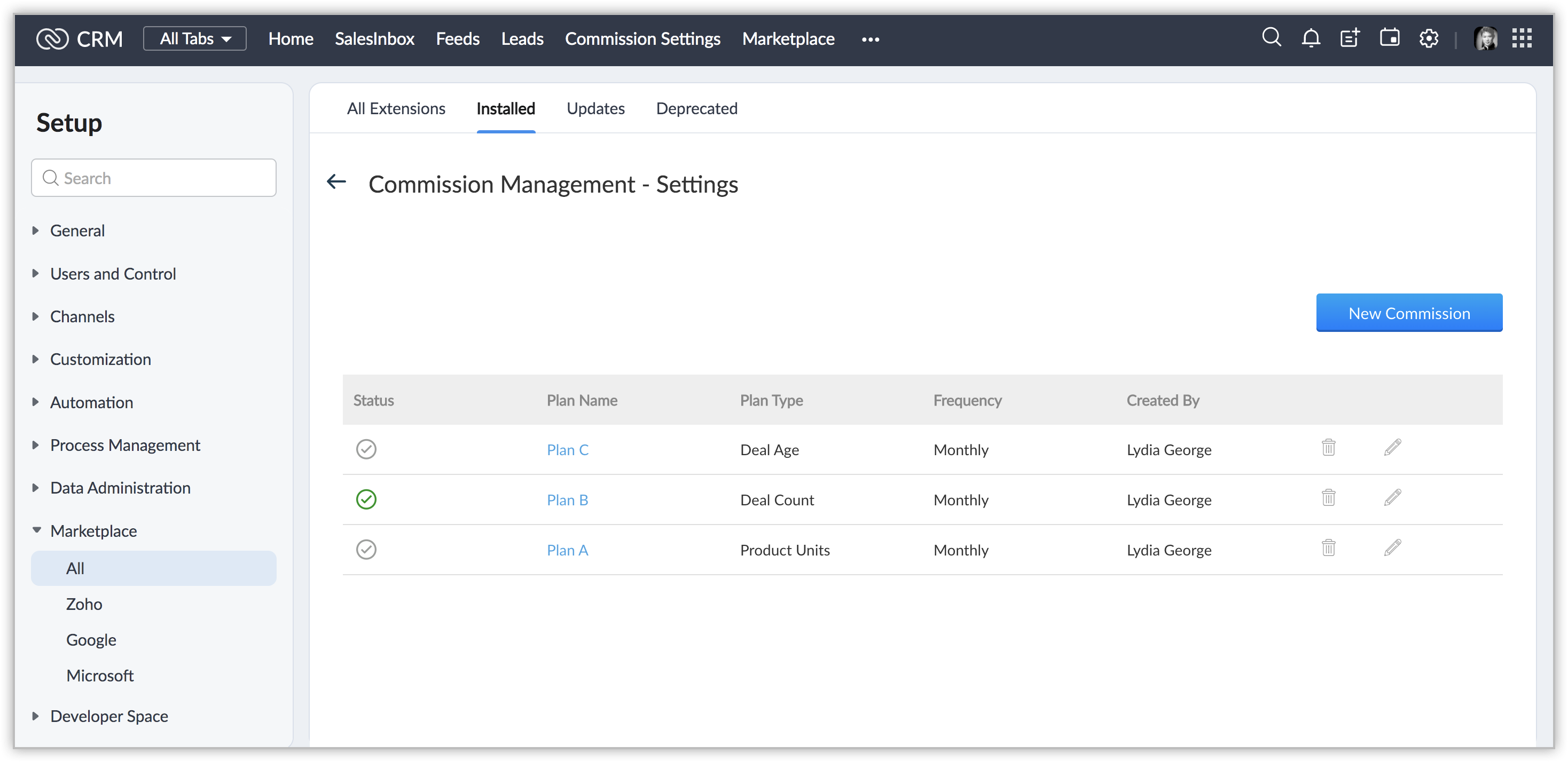 Extensia Commission Management pentru Zoho CRM va calcula automat suma comisionului pentru agenții de vânzări din Zoho CRM. Extensia calculează suma comisionului pe baza setărilor personalizate ale planului de comision al fiecărui utilizator, de fiecare dată când o tranzacție este câștigată în Zoho CRM. Administratorul CRM poate actualiza suma comisionului oricând este necesar, pentru oricâți agenți de vânzări.