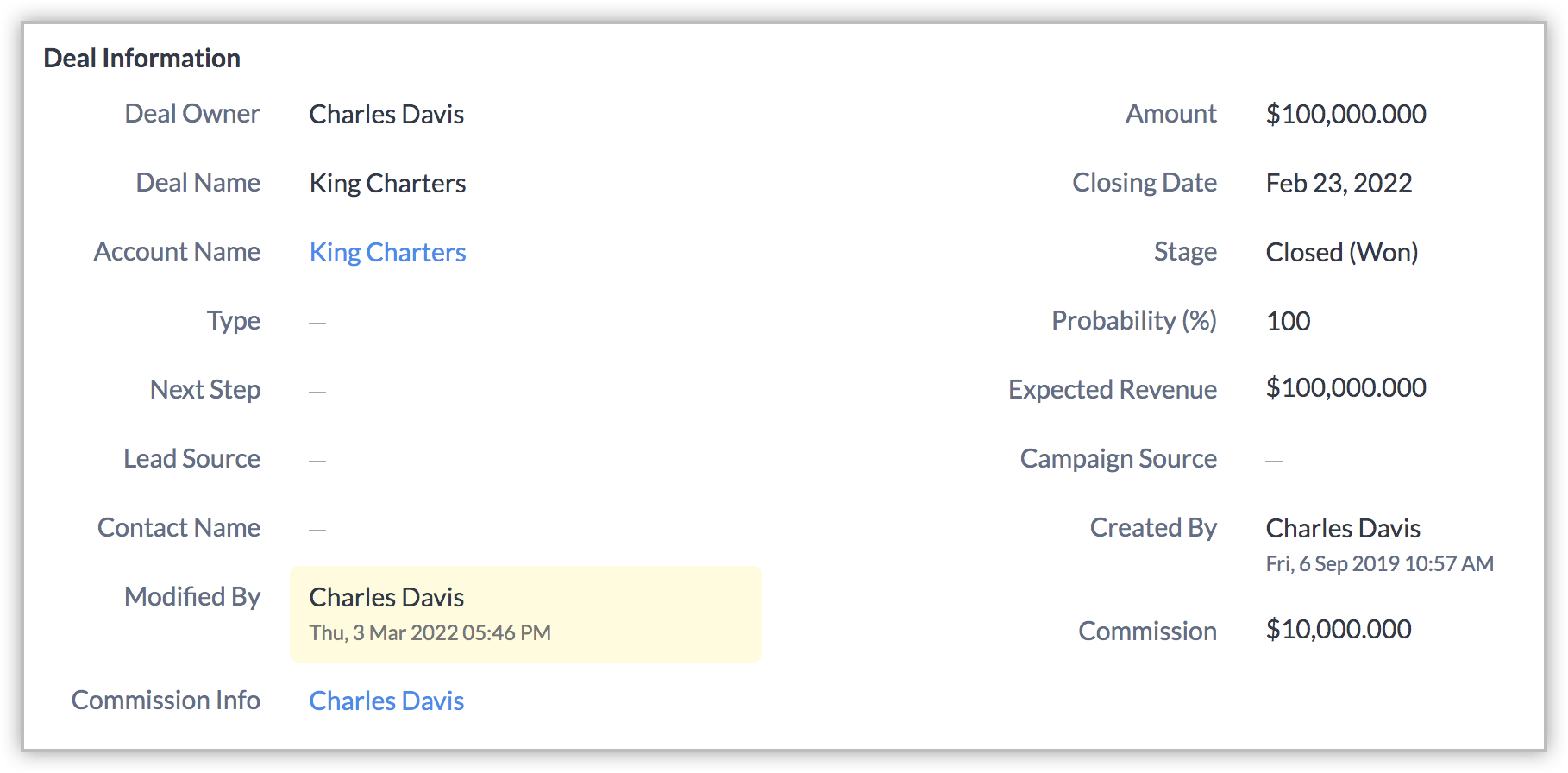 - Deal Age: Comisionul va fi actualizat odată ce tranzacția este închisă cu o dată de închidere și statusul este schimbat în Closed Won în modulele Deals și Commission Info.