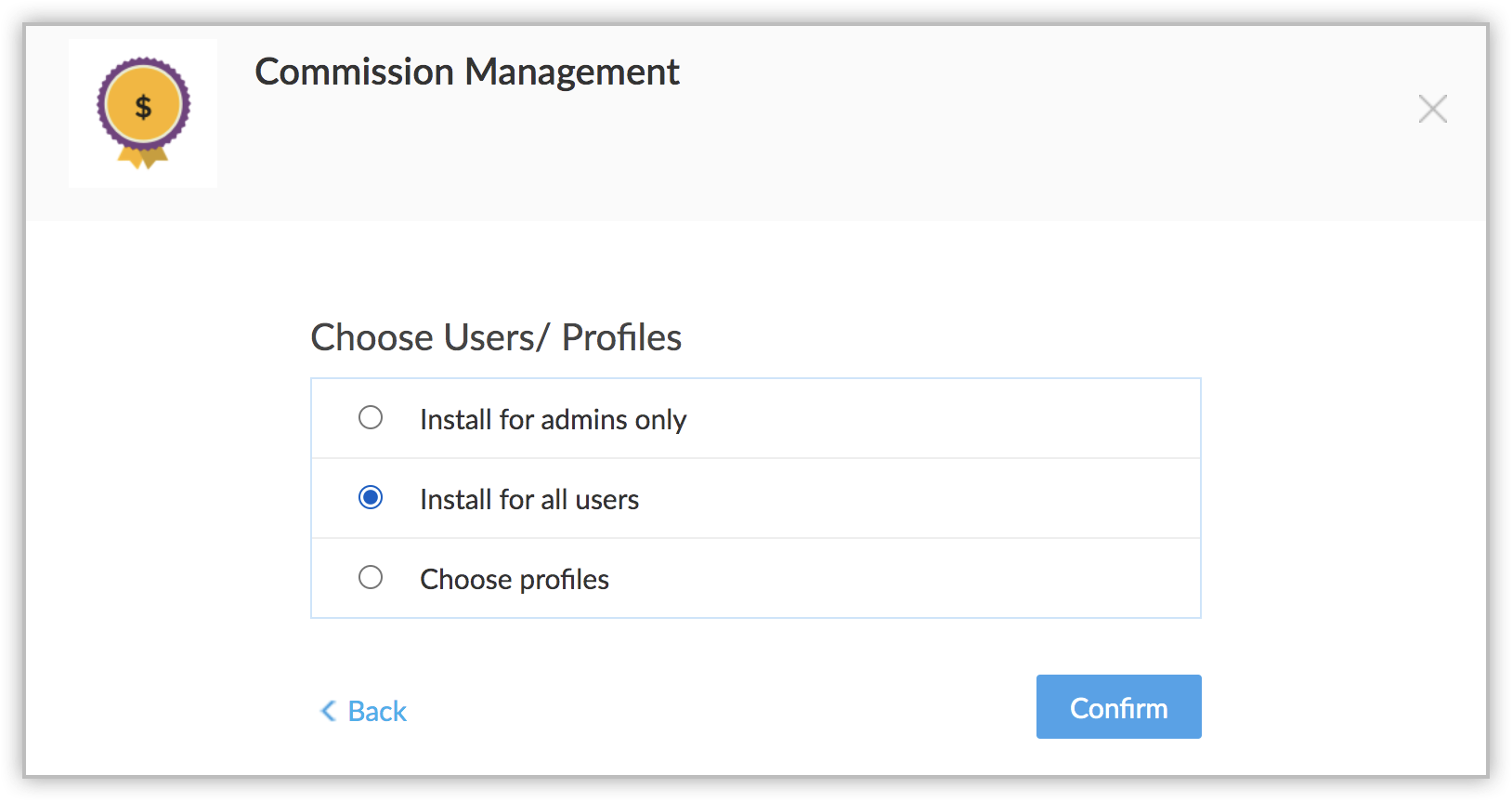 - Choose profiles: Extensia va fi instalată în CRM doar pentru utilizatorii cu profilurile selectate. Dacă alegi această opțiune, apasă pe Continue, apoi selectează profilurile.