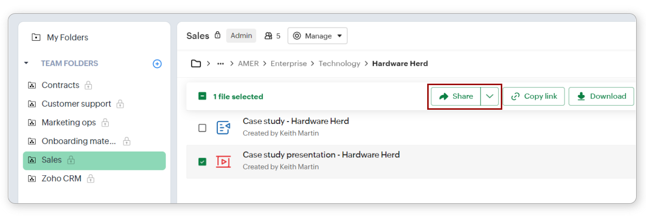 Partajează fișiere și foldere intern dintr-un Team Folder