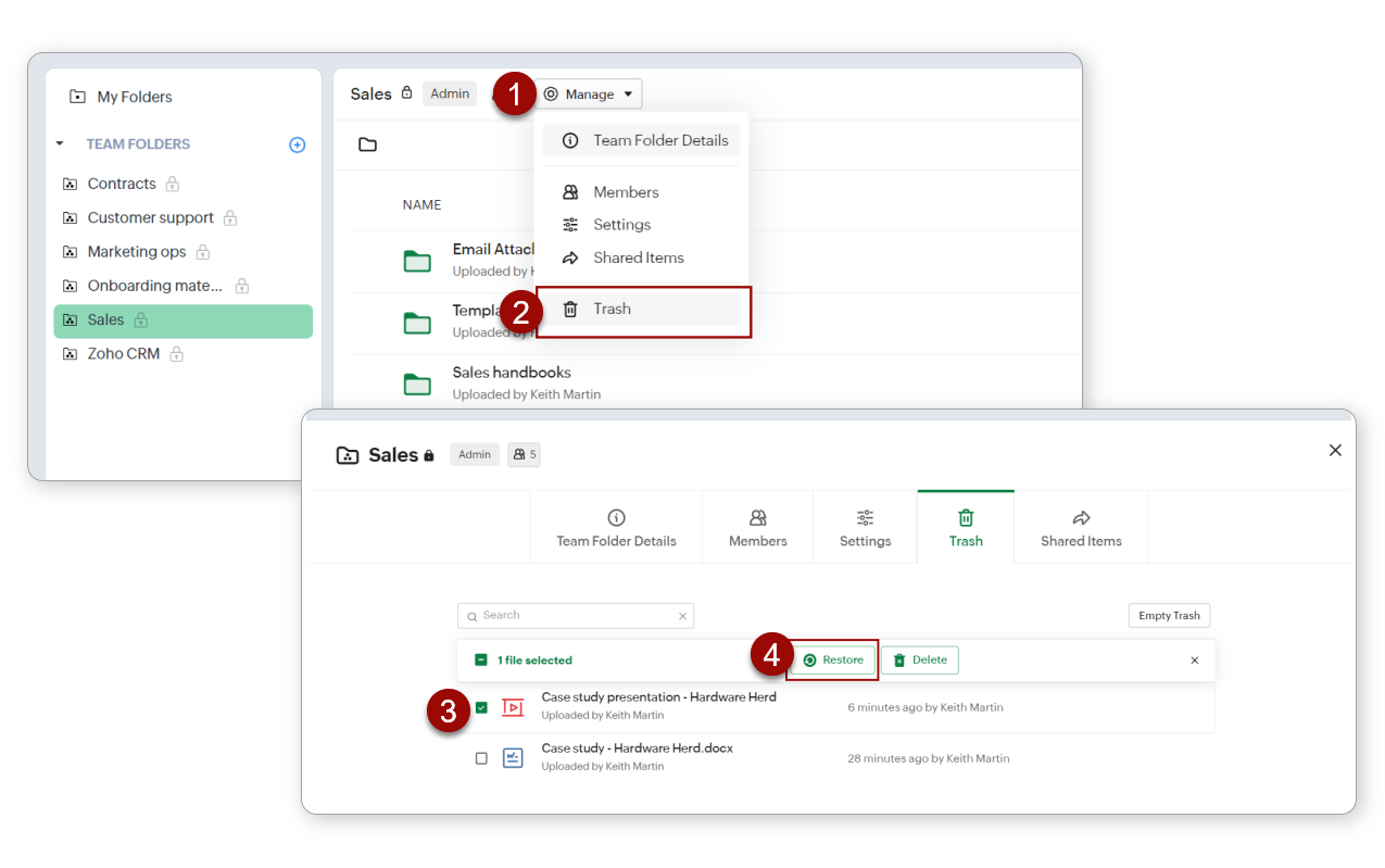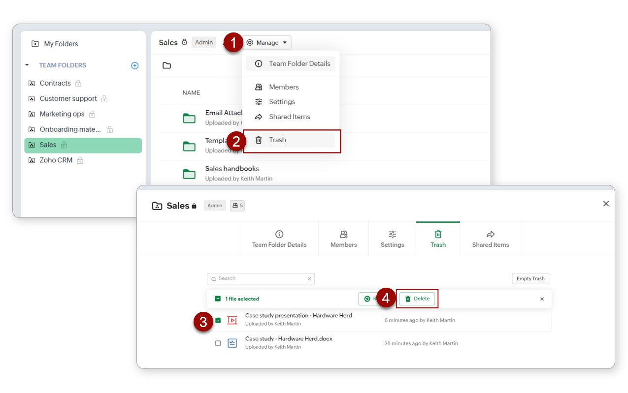 Notă: Poți restaura un fișier șters navigând la Manage > Trash, selectând fișierul și făcând clic pe Restore.