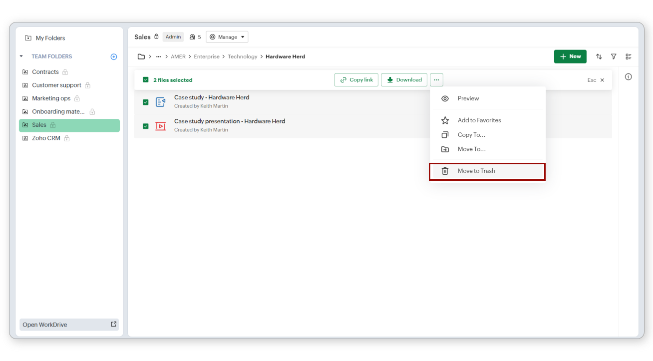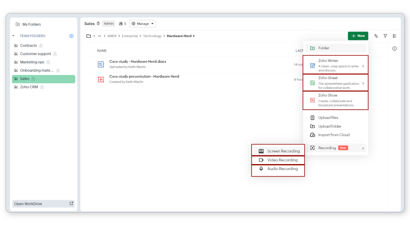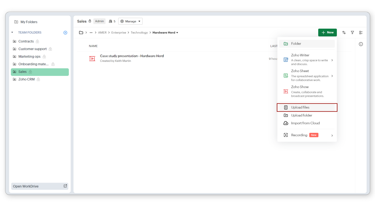 Poți crea și încărca orice fișier în tab-ul Documents, atâta timp cât nu ai depășit spațiul de stocare disponibil. În mod implicit, vei avea acces la Zoho Office Suite pentru a crea documente, foi de calcul și prezentări folosind Zoho Writer, Zoho Sheet și respectiv Zoho Show. Ai opțiunea de a converti fișierele încărcate în formate compatibile cu aplicațiile Zoho Office Suite. Toate datele tale din WorkDrive sunt criptate atât în tranzit, cât și în repaus.