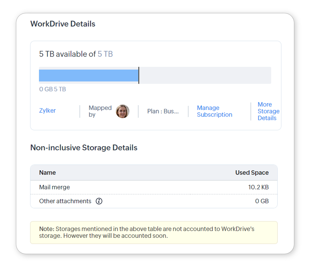 În secțiunea WorkDrive Details, poți vedea spațiul total de stocare disponibil și cantitatea de stocare utilizată în momentul respectiv.