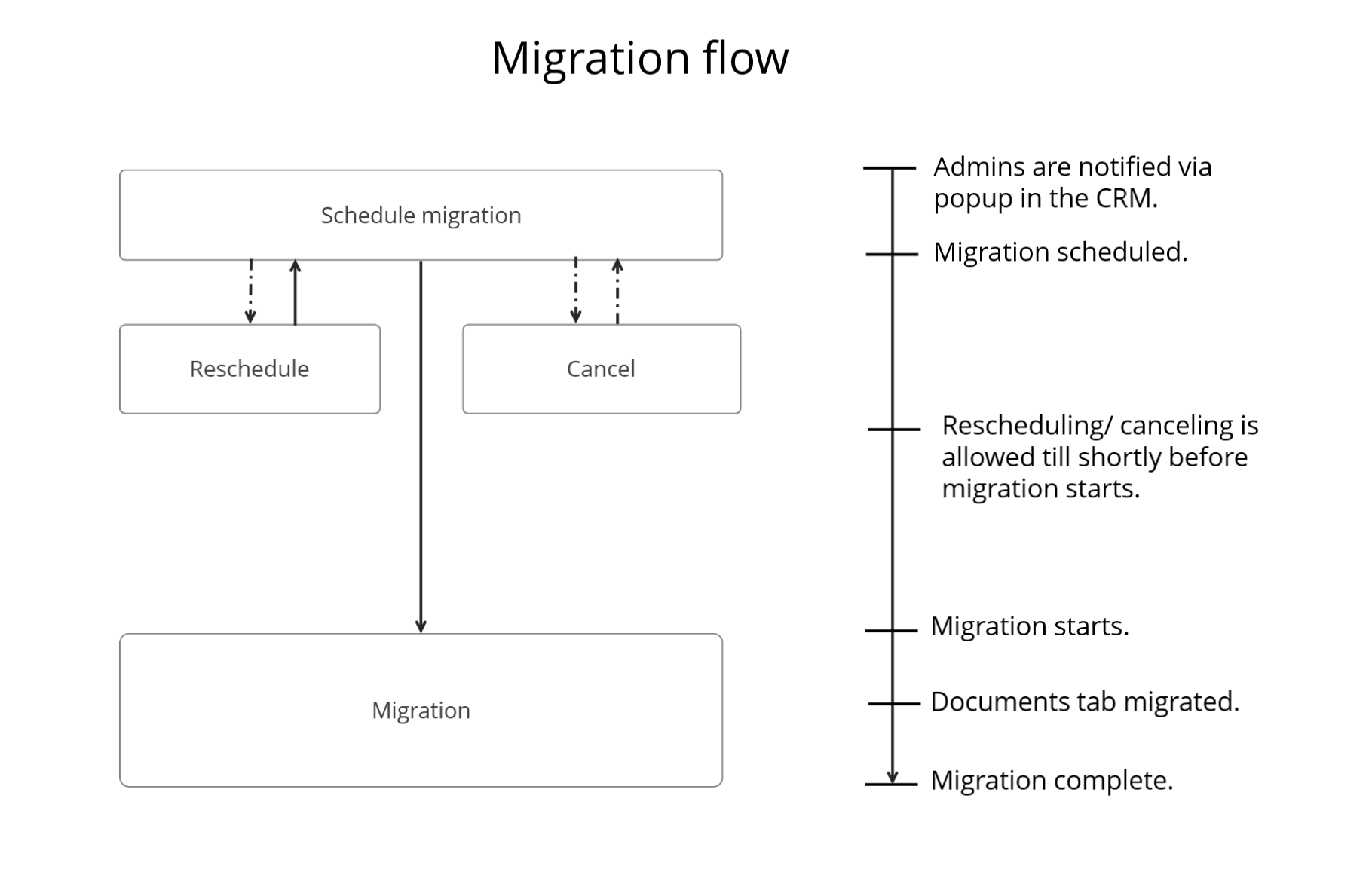 CRM-ul va rămâne accesibil pe tot parcursul migrării. Când tab-ul Documents este migrat, doar acel tab va fi inaccesibil.