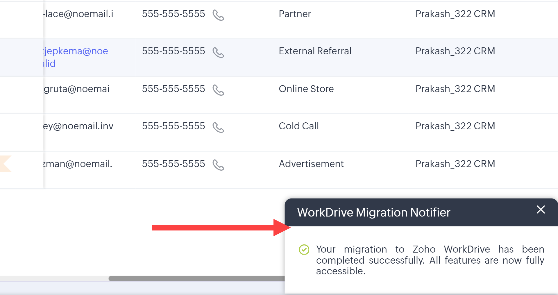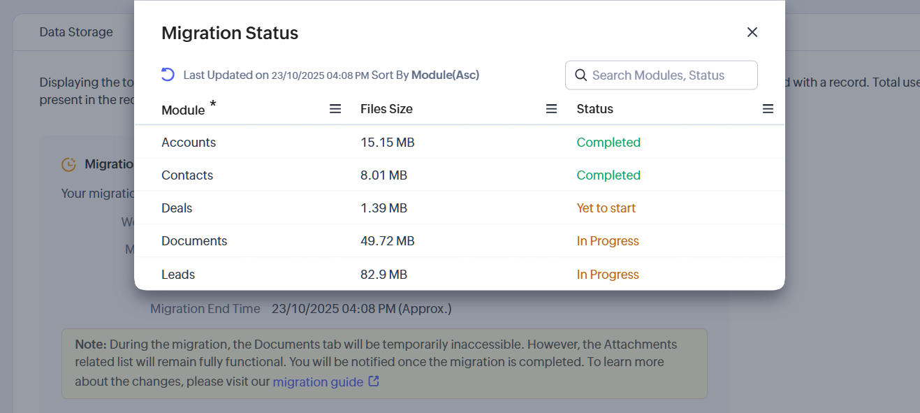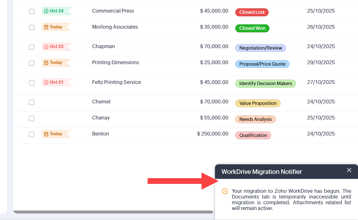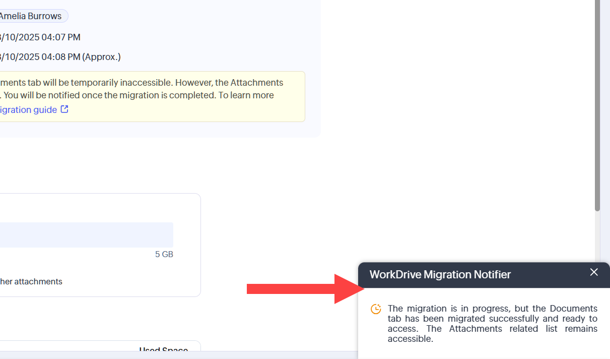 Pentru mulți utilizatori Zoho CRM, tab-ul Documents era alimentat de Zoho Docs. Aceasta înseamnă că fișierele și atașamentele erau stocate în Zoho Docs. Aceste fișiere și atașamente vor fi migrate acum în Zoho WorkDrive. Această schimbare le permite utilizatorilor să beneficieze de interfața superioară a WorkDrive, de capabilitățile avansate de gestionare a fișierelor, de stocarea mai economică și de funcțiile moderne de colaborare.