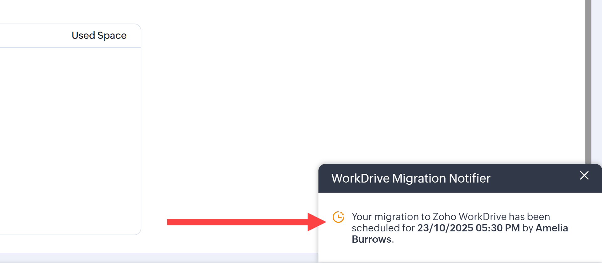 Procesul de migrare este vizibil pentru toți utilizatorii admin. Te rugăm să fii atent atunci când selectezi echipa WorkDrive, deoarece odată ce o echipă este aleasă, selecția nu poate fi anulată.
