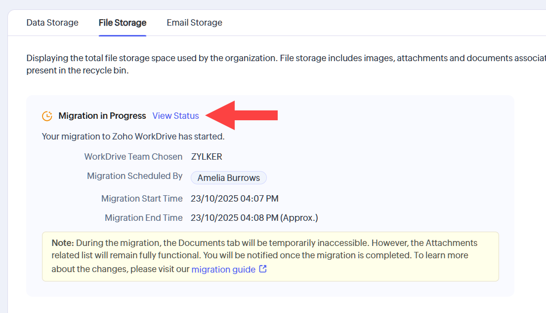 Acum, fișierele din lista corelată de atașamente a înregistrărilor vor fi migrate. Adminii pot verifica starea migrării navigând la Setup ⚙️> Data Administration > Storage > File Storage și apăsând pe View Status.