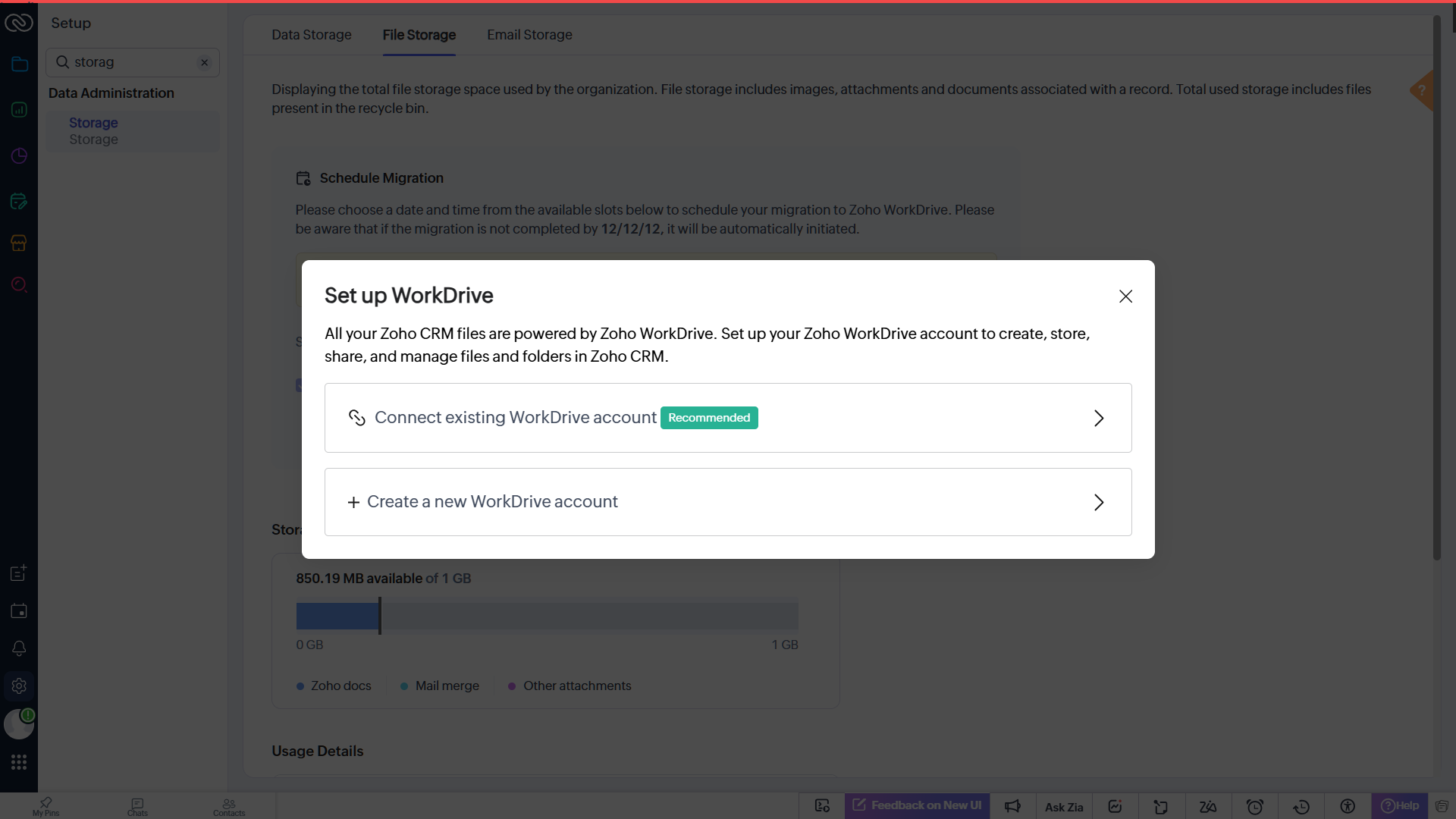 Când programezi migrarea, vei primi o fereastră pop-up prin care poți alege contul WorkDrive care trebuie conectat la CRM.