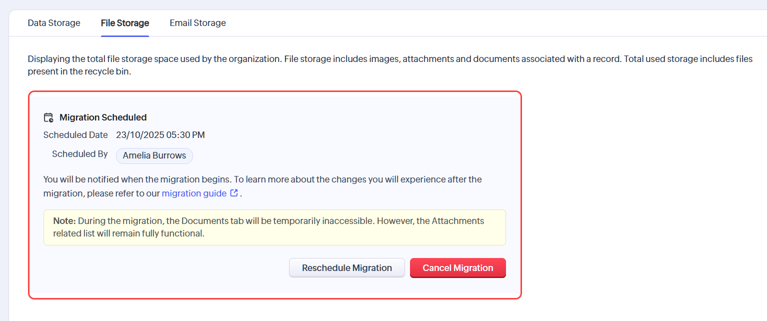 În orice moment, utilizatorii pot programa, reprograma sau anula migrarea programată navigând la Setup ⚙️> Data Administration > Storage > File Storage.