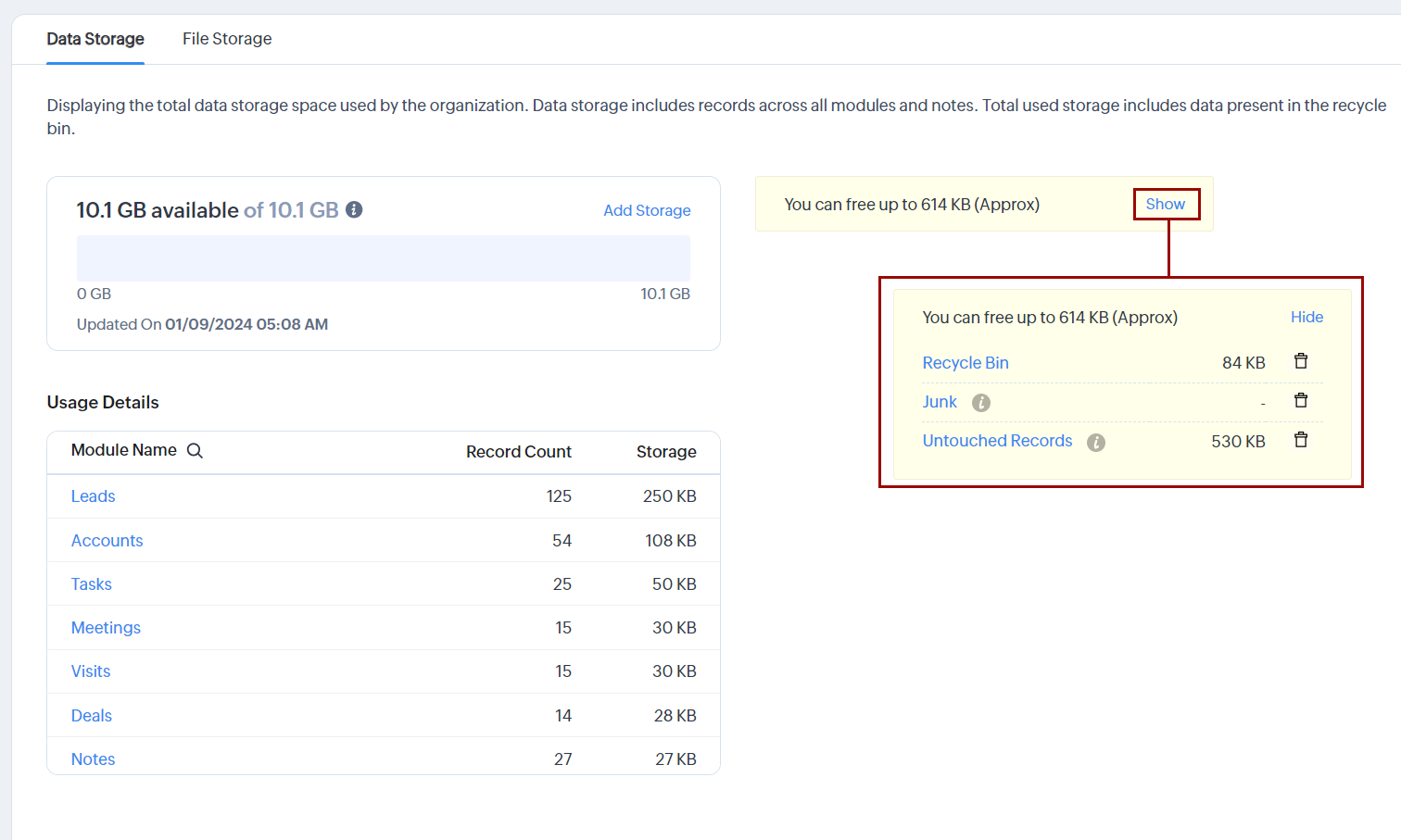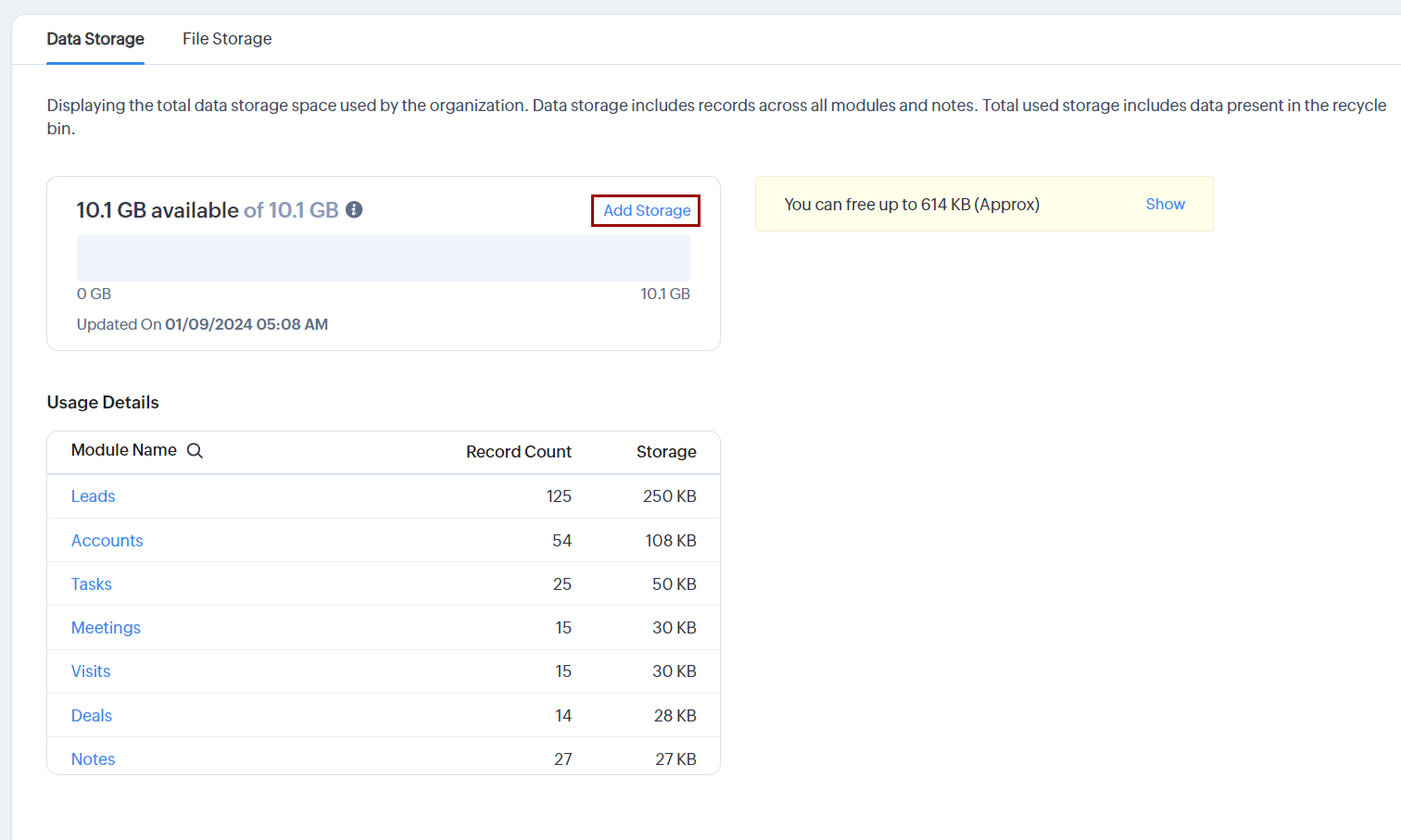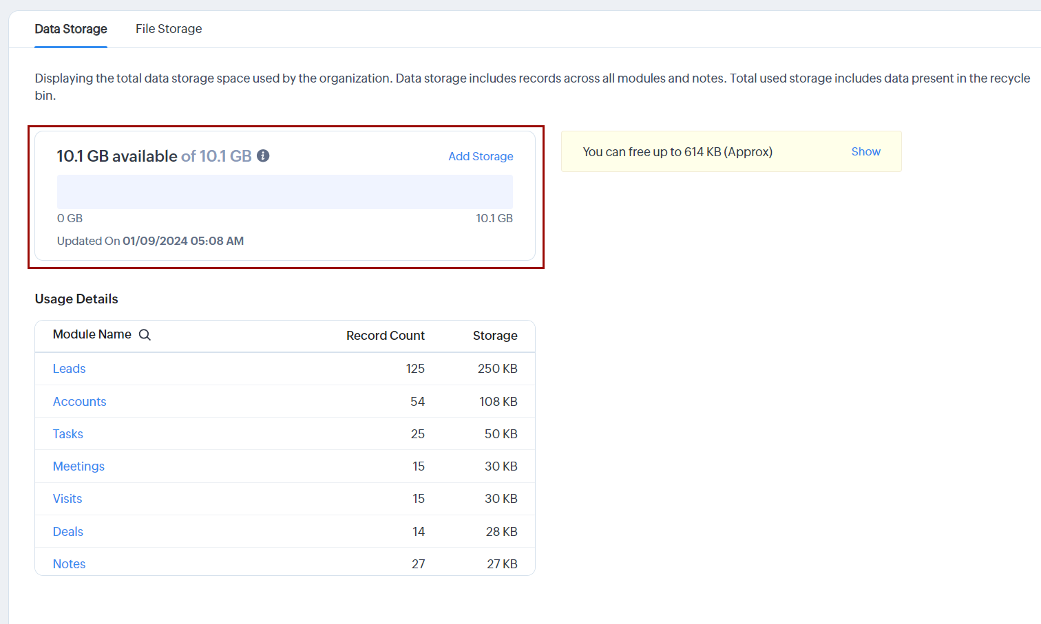 Spațiul de stocare în Zoho CRM este împărțit în două categorii: Date și Fișiere pentru o reprezentare mai clară. Aceste categorii sunt clasificate în continuare în Stocare și Detalii de utilizare.