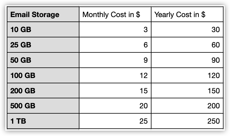 Stocarea maximă pentru emailuri oferită de Zoho CRM pentru o organizație este de 500GB sau 5GB per licență de utilizator, oricare este mai mică. În funcție de importanța emailurilor trimise de utilizatori, administratorii pot gestiona emailurile. Administratorul poate considera că emailurile unui utilizator nu sunt deosebit de importante și poate solicita ștergerea lor. Mai mult spațiu de stocare este pus la dispoziție pentru utilizatorii cu emailuri mai importante prin ștergerea emailurilor mai puțin relevante. Chiar dacă se estimează la 5GB per utilizator, stocarea emailurilor este totuși partajată.