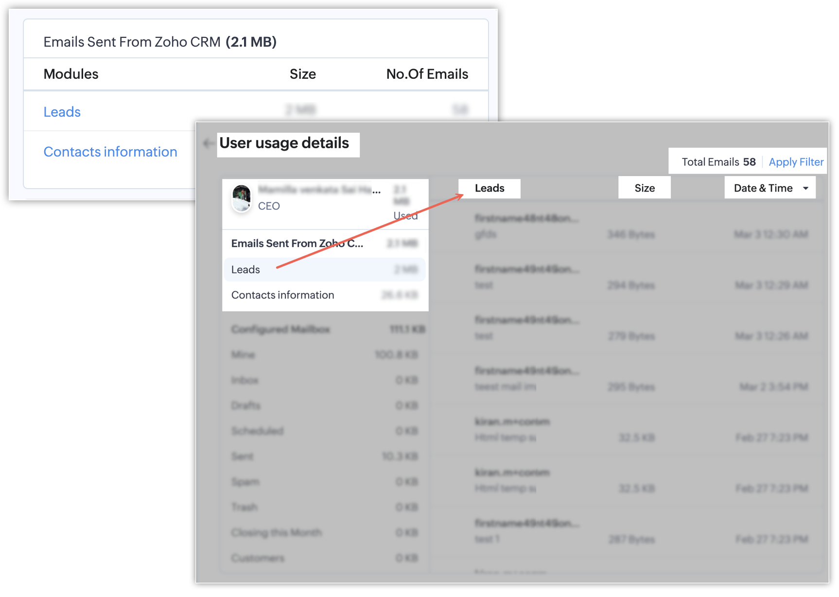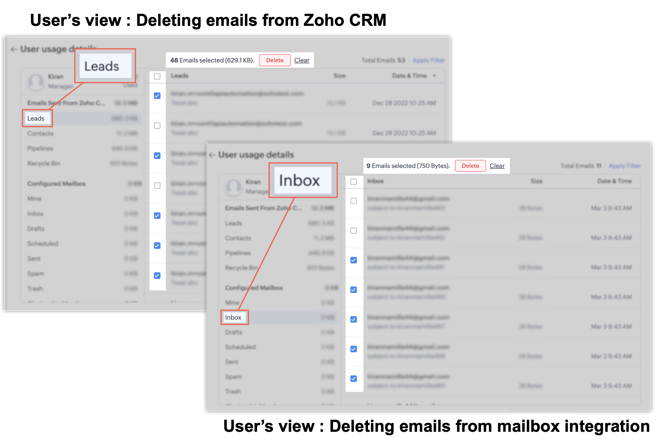 Fă clic pe oricare dintre module pentru a obține o vizualizare a tuturor emailurilor trimise din acel modul specific. Similar cu vizualizarea administratorului, putem filtra emailurile pe baza câmpurilor și factorilor de email. Aici, deoarece utilizatorul poate vizualiza doar propriile detalii de stocare a emailurilor, poate șterge ambele seturi de emailuri (Zoho CRM și Căsuța poștală) direct din Zoho CRM.