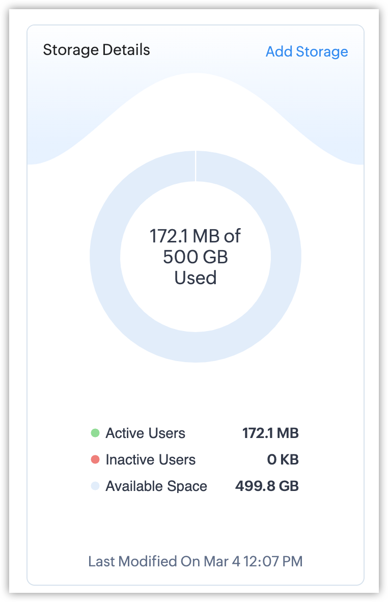 Detaliile de stocare reprezintă o vizualizare consolidată a stocării emailurilor. Detaliile de stocare sunt prezentate într-un format de grafic, spațiul ocupat și spațiul liber (stocare rămasă) sunt vizualizate în grafic. Stocarea ocupată de utilizatorii activi și inactivi este, de asemenea, afișată. Valorile vor fi actualizate printr-un programator. Administratorii pot găsi ora la care programatorul a rulat în partea de jos a graficului.
