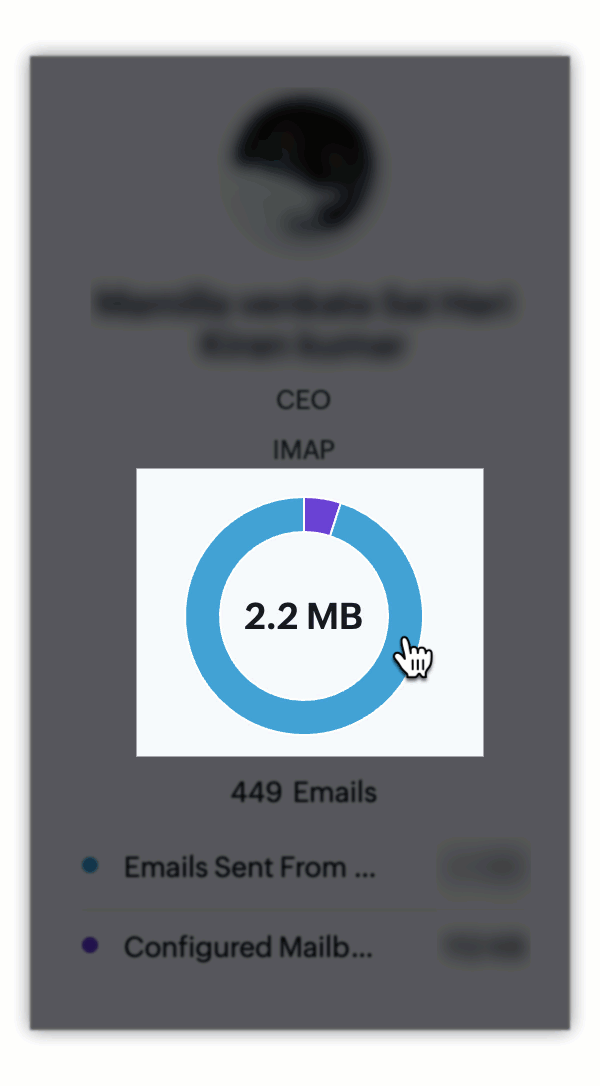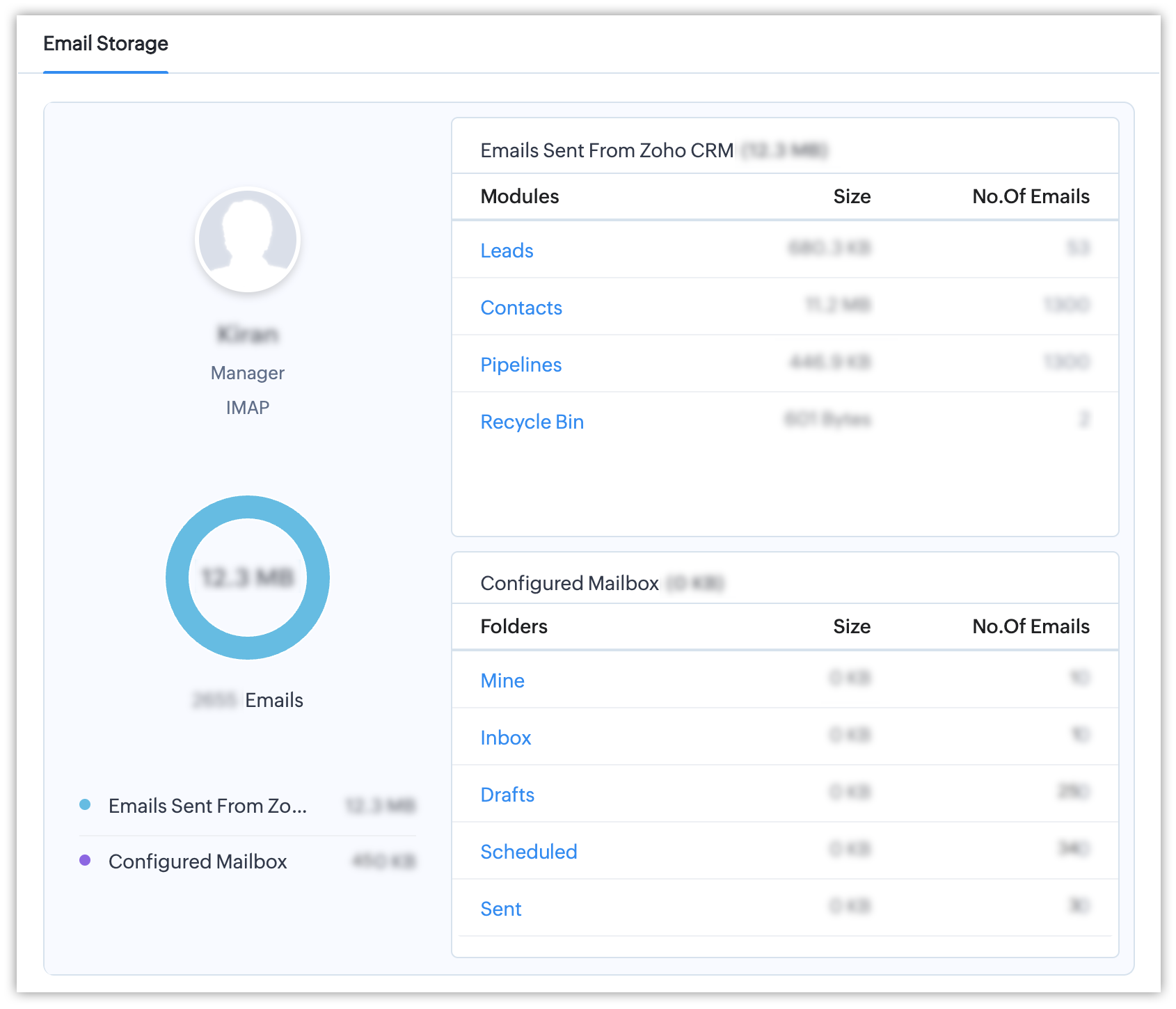 Va fi afișată o vizualizare consolidată sub formă de grafic a detaliilor de stocare. Detaliile de stocare despre emailurile trimise din Zoho CRM și din căsuța poștală vor fi, de asemenea, afișate. Emailurile trimise direct din Zoho CRM sunt clasificate pe baza modulelor din care au fost trimise.