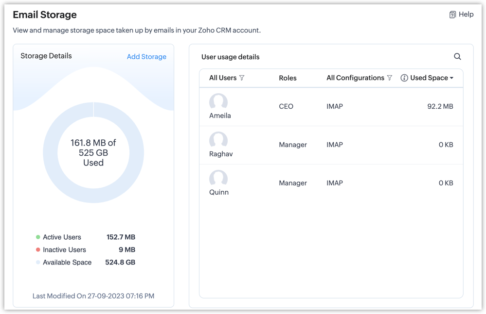 Emailurile sunt unul dintre mediile importante de comunicare în orice afacere. În Zoho CRM, utilizatorii pot trimite emailuri direct din Zoho CRM sau din căsuța poștală. Până acum, emailurile au fost stocate alături de datele și fișierele din CRM fără a avea o politică clară de stocare stabilită. Cantitatea de stocare pentru emailuri utilizată de organizații și utilizatorii lor nu a fost distribuită echitabil. Cu această funcționalitate, Zoho CRM se asigură că toată lumea are acces la aceeași cantitate de stocare pentru emailuri. De asemenea, aceasta oferă administratorilor un panou de control pentru a urmări cât spațiu de stocare pentru emailuri folosesc utilizatorii lor, precum și o opțiune de a le gestiona (șterge emailurile inutile pentru a elibera spațiu). Utilizatorii vor avea, de asemenea, propria vizualizare asupra utilizării stocării lor. Această funcționalitate este disponibilă pentru toate edițiile; doar dimensiunea stocării diferă pentru utilizatorii gratuiți și cei plătiți.