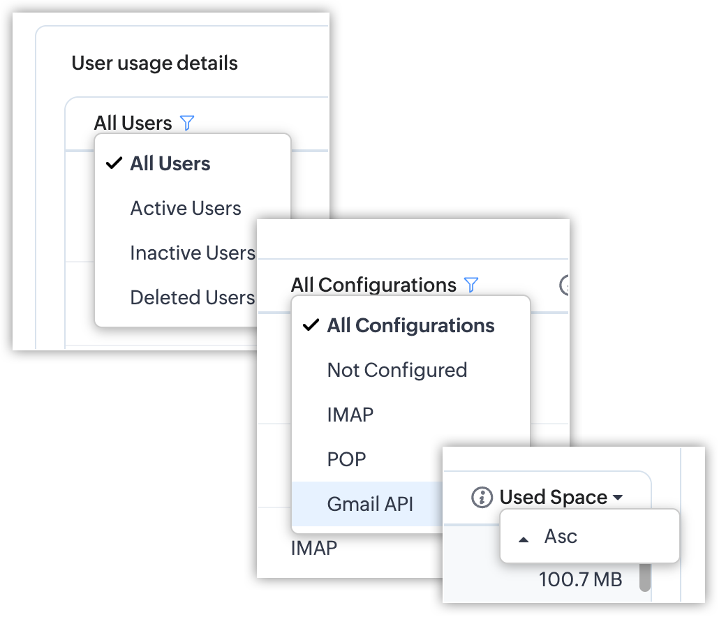 Aici, în tab-ul detalii utilizare utilizatori, stocarea ocupată de toți utilizatorii este afișată. Pentru administratori, sunt afișate detaliile de stocare atât ale administratorilor, cât și ale utilizatorilor. În acest tab, poți filtra emailurile pe baza detaliilor utilizatorului, configurațiilor, și poți sorta emailurile în funcție de ordine (Crescător/Descrescător).