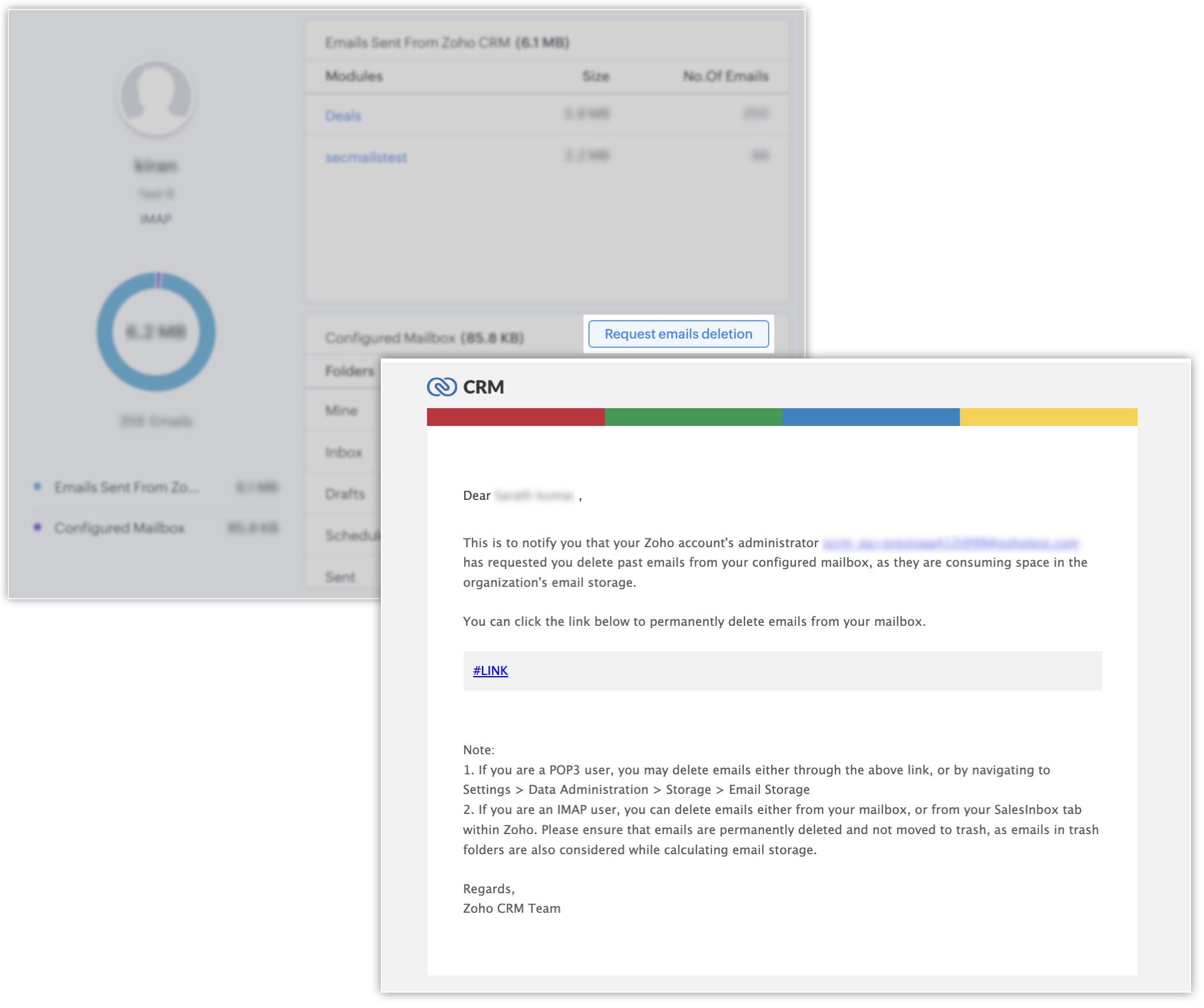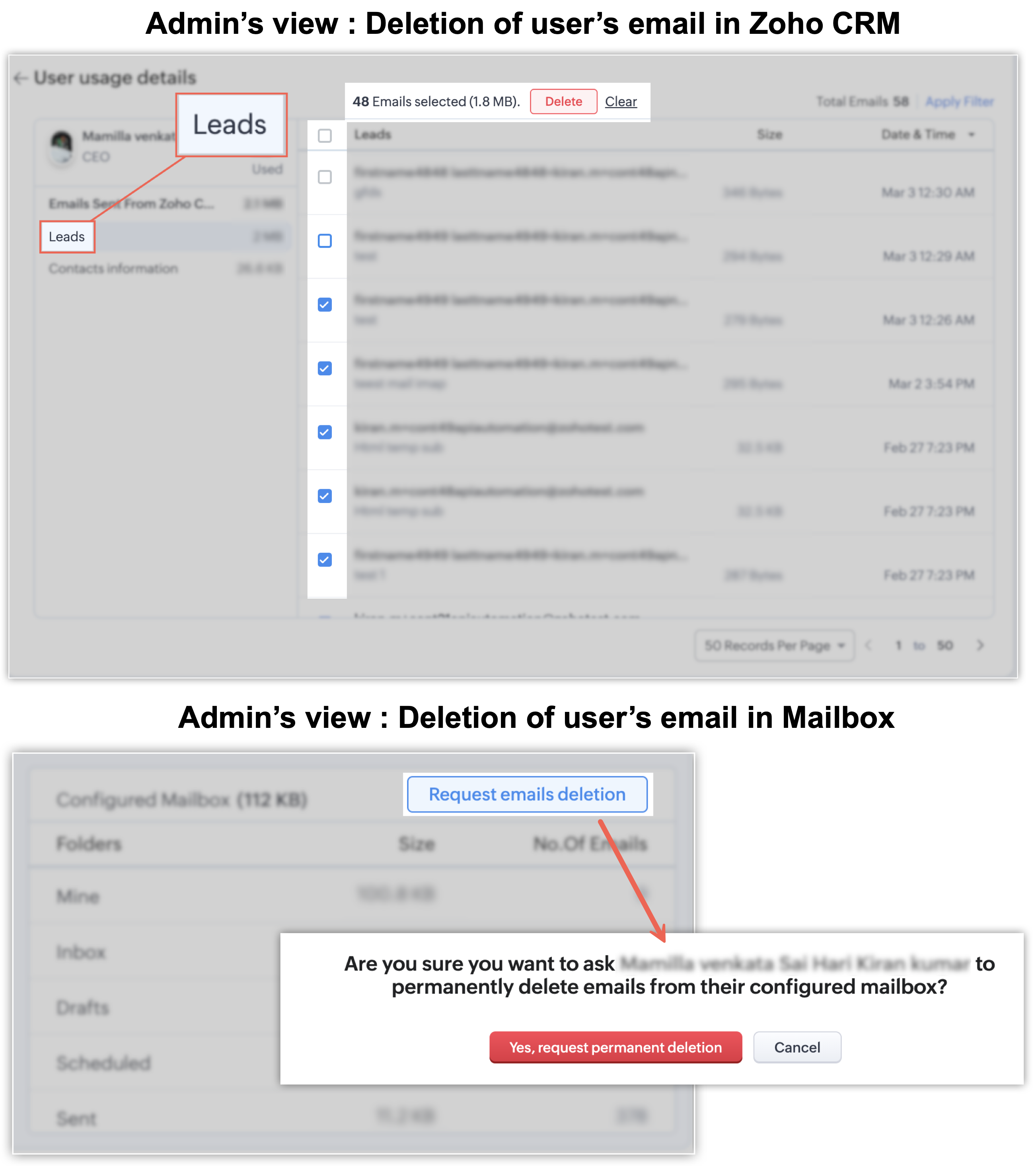 Dacă administratorii își vizualizează propriul profil, emailurile trimise din Zoho CRM și emailurile trimise din configurația căsuței poștale pot fi șterse direct din Zoho CRM. În cazul în care administratorul dorește să șteargă emailurile stocate de alți utilizatori, poate șterge doar emailurile trimise din Zoho CRM. Emailurile trimise din configurația căsuței poștale nu pot fi șterse de administratori; doar utilizatorul respectiv își poate șterge emailurile configurate din căsuța poștală. Un buton este afișat deasupra tab-ului configurare căsuță poștală, de unde administratorii pot solicita ștergerea emailurilor din căsuța poștală a utilizatorului respectiv.
