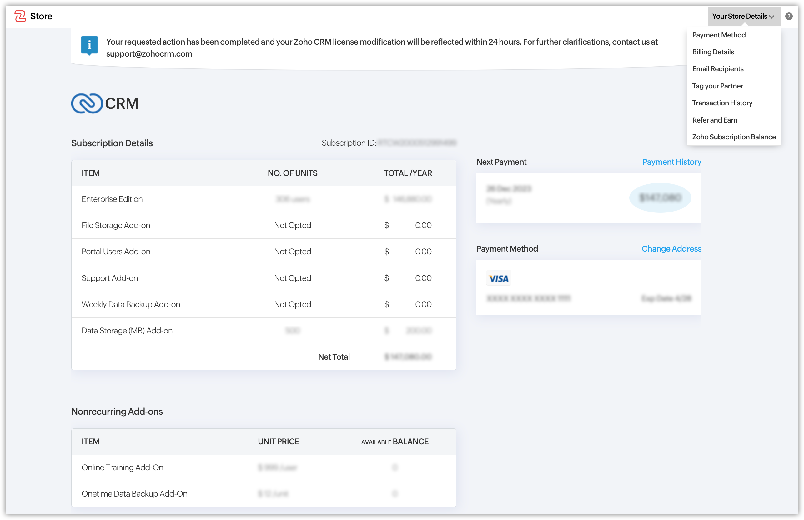 Achizițiile de stocare făcute prin Zoho Mail sunt separate de achizițiile de stocare făcute prin Zoho CRM. Va trebui să achiziționezi mai mult spațiu dacă Zoho Mail rămâne fără spațiu. În mod similar, dacă stocarea Zoho CRM este insuficientă, utilizatorul trebuie să achiziționeze și aceasta.