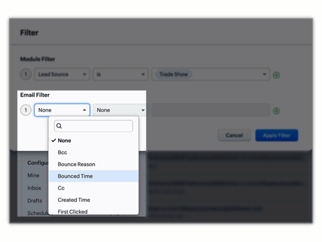 Pentru a ușura ștergerea, Zoho CRM are o opțiune Aplică filtru care filtrează emailurile pe baza modulelor și valorii câmpului de email. Filtrarea pe baza modulelor include câmpul modulului respectiv, în timp ce pentru filtrarea pe baza emailurilor, folosim unele atribute, cum ar fi Trimis de, Trimis din, și altele.