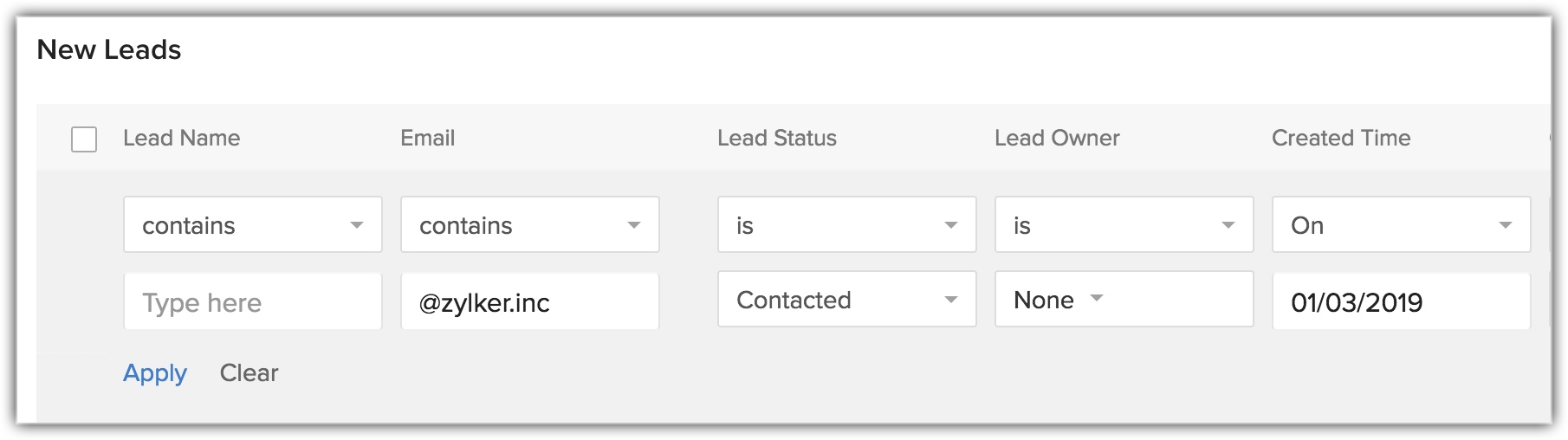Să presupunem că Zylker a organizat recent un webinar la care au participat 200 de participanți. Ca acțiune de follow-up, doresc să trimită broșura produsului doar acelor participanți care aparțin industriei imobiliare. Pentru a afla care participant aparține domeniului imobiliar, trebuie să parcurgă înregistrările individuale, ceea ce poate fi obositor și consumator de timp. Pentru a rezolva astfel de situații, îți permitem să filtrezi înregistrările pe baza unor criterii specifice. Poți folosi orice câmp pentru a seta aceste criterii, cu condiția ca aceste câmpuri să fie deja adăugate în lista asociată.