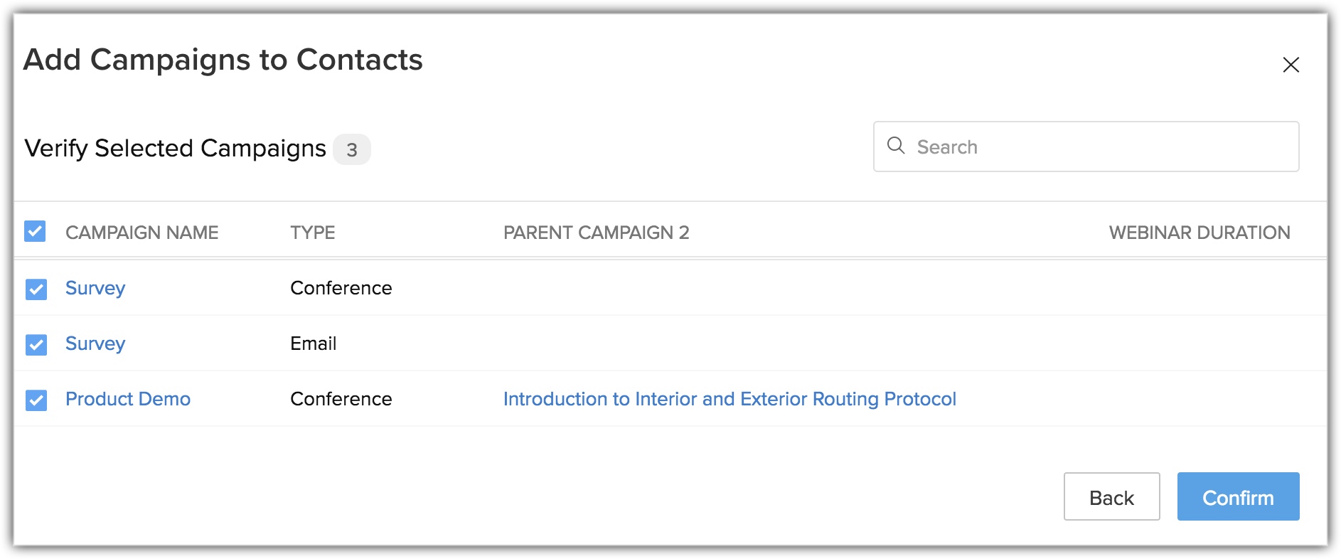 De exemplu, dacă ai organizat un webinar pentru 200 de participanți și la final trimiți un sondaj și decizi să organizezi o demonstrație de produs doar pentru acei participanți care completează sondajul. În astfel de cazuri, ar fi rațional să legi aceste trei campanii într-o relație părinte-copil, deoarece au loc în succesiune. Aceasta te va ajuta să analizezi dacă webinarul sau sondajul a reprezentat o utilizare mai bună a costurilor tale de marketing. De asemenea, poți monitoriza statisticile agregate pentru a examina starea generală a inițiativelor tale de marketing.