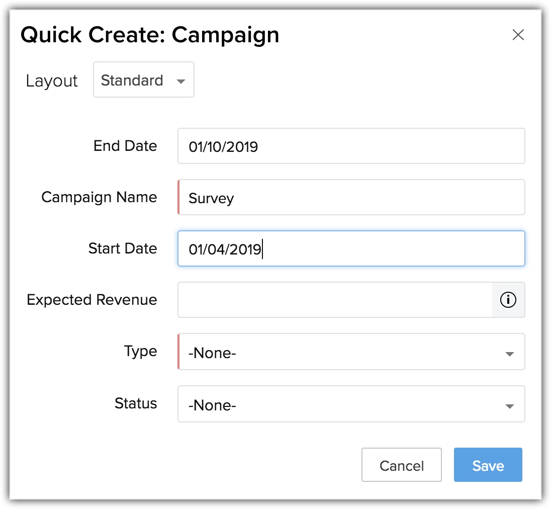- Create New - Poți selecta această opțiune pentru a crea o campanie nouă. În Quick Create Campaign, introdu detaliile și dă clic pe Save.