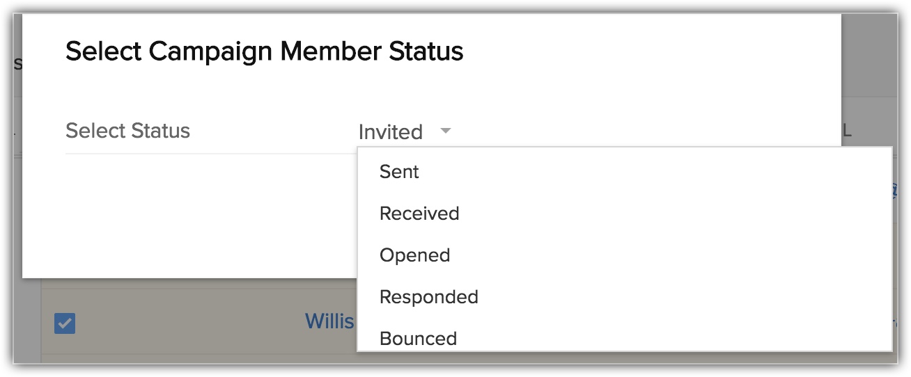 Statutul membrului campaniei arată statutul leads sau contacts într-o campanie particulară, cum ar fi invitat, primit, trimis etc. Poți actualiza în masă statutul membrilor leads sau contacts din pagina de detalii a Campaniei.